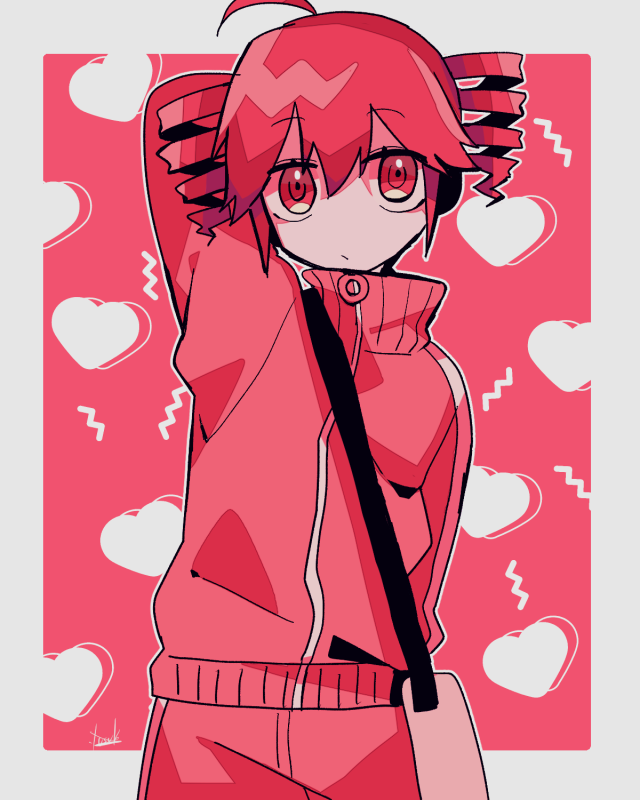 1girl arm_behind_head bag drill_hair expressionless heart high_collar jacket kasane_teto looking_at_viewer red_eyes red_hair solo track_jacket track_suit twin_drills utau yuusuke-kun