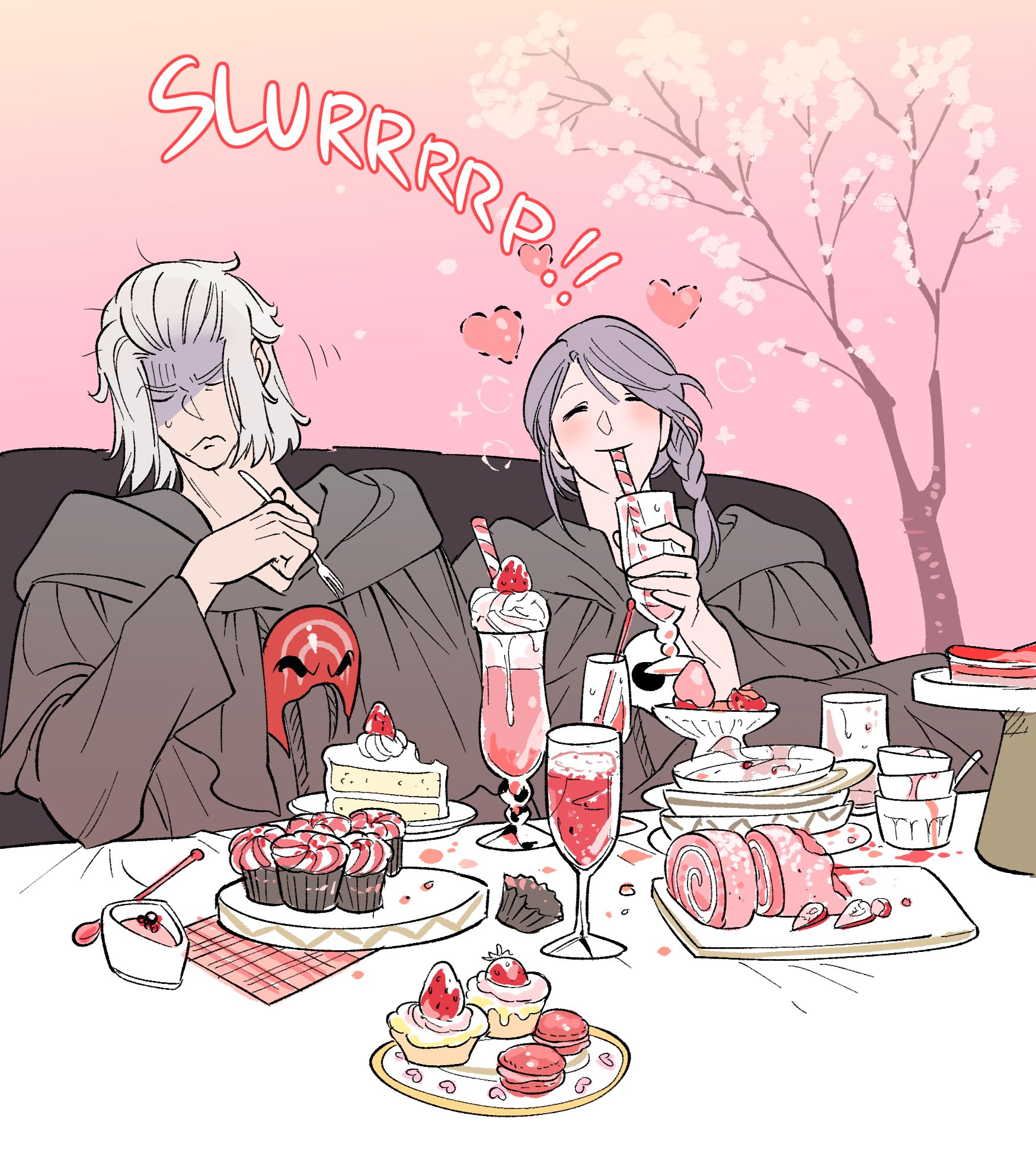 2boys 5altybitter5 braid cherry_blossoms closed_eyes closed_mouth cupcake emet-selch final_fantasy final_fantasy_xiv food fork fruit glass grey_robe highres holding holding_fork hythlodaeus ice_cream mask mask_around_neck multiple_boys purple_hair robe slurping_(food) smile sophist's_robe_(ff14) strawberry tree turn_pale