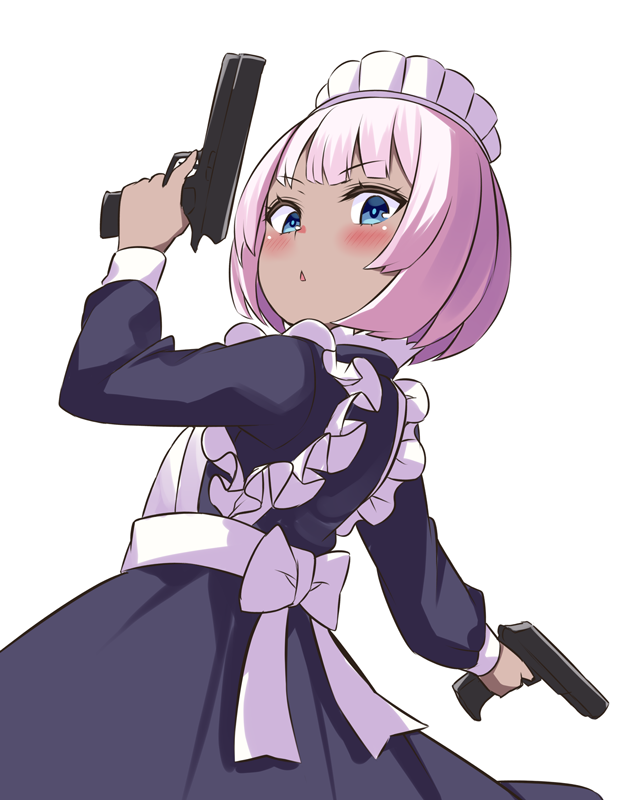1girl apron blue_dress blue_eyes blush commentary_request dress dual_wielding from_behind gun handgun holding holding_gun holding_weapon looking_at_viewer looking_to_the_side maid maid_apron maid_headdress medium_hair open_mouth original pink_hair s_(hdru2332) simple_background weapon weapon_request white_apron white_background