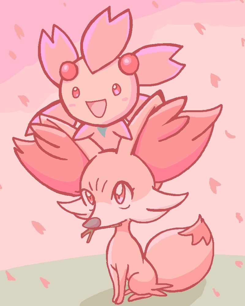 animal_ear_fluff animal_focus blush_stickers cherrim cherrim_(sunshine) cherry_blossoms fennekin full_body gardear058 gen_4_pokemon gen_6_pokemon happy jaggy_lines mouth_hold nintendo no_humans on_head open_mouth petals pokemon pokemon_(creature) pokemon_focus pokemon_on_head red_eyes sitting smile stick