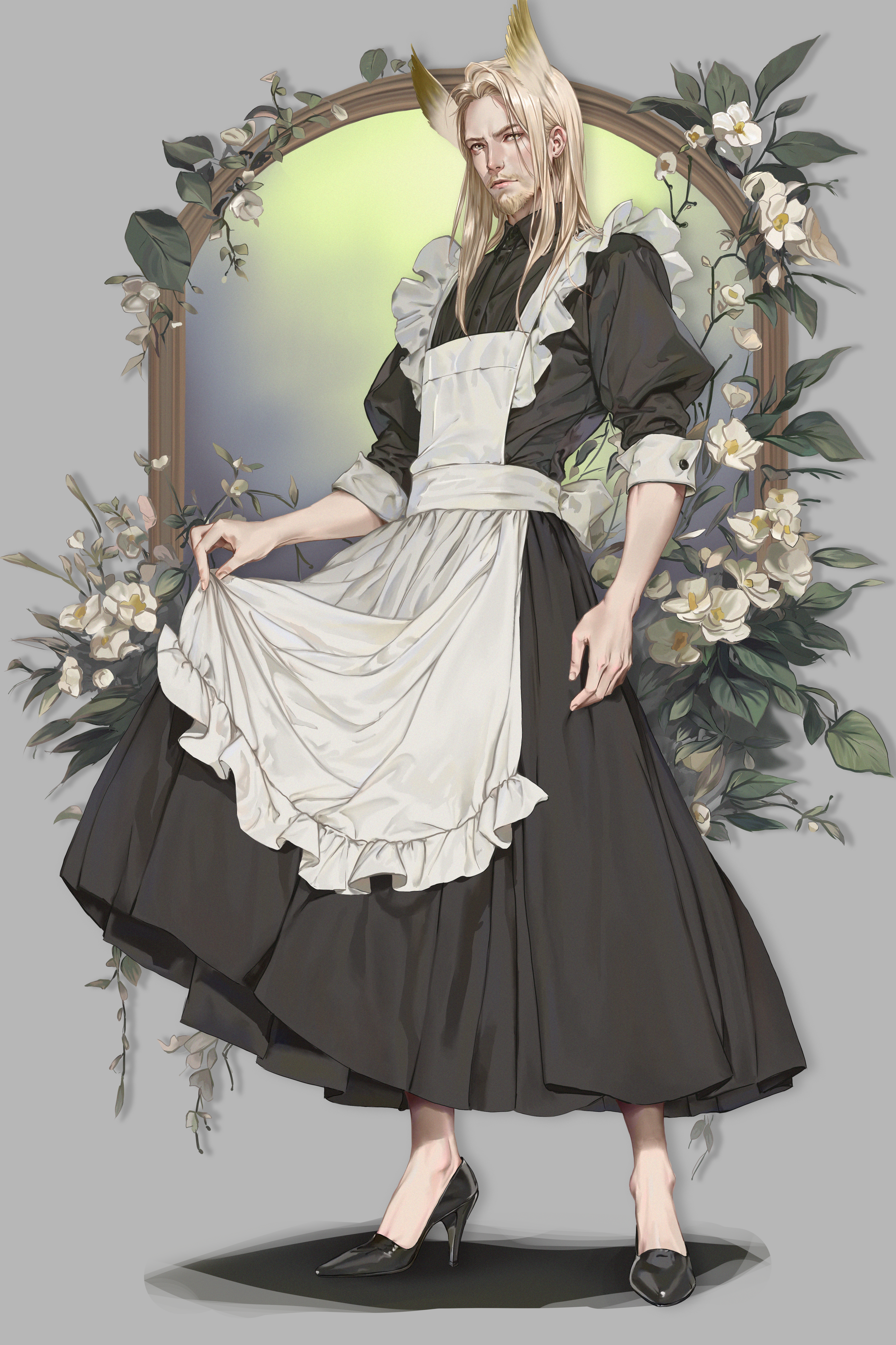 1boy absurdres adibulka arknights black_footwear crossdressing crossdressing_(mtf) dress hellagur_(arknights) high_heels highres long_hair maid male_maid sleeves_rolled_up solo