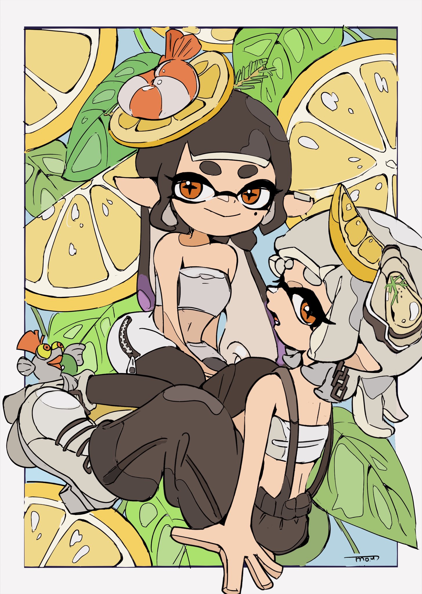 2girls baggy_pants black_hair blue_background border callie_(splatoon) callie_(summer_nights)_(splatoon) food fruit grey_border highres inkling leaf lemon lemon_slice long_hair looking_at_viewer looking_back marie_(splatoon) marie_(summer_nights)_(splatoon) mole mole_under_eye moyu_u0 multiple_girls navel nintendo official_alternate_costume official_alternate_hairstyle orange_eyes oyster pants platform_footwear salmonid shrimp sitting skirt smallfry_(splatoon) smil3 smile splatoon_(series) splatoon_3 strapless tentacle_hair tube_top white_hair zipper zipper_pull_tab