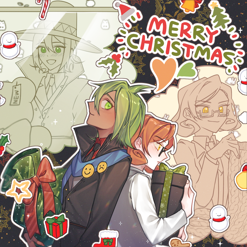1boy 1girl ahoge back-to-back badge bell black-framed_eyewear black_background black_coat black_necktie blue_scarf blush border candy candy_cane christmas christmas_tree closed_mouth coat collared_coat collared_shirt commentary_request curly_hair danganronpa_(series) danganronpa_another dark-skinned_male dark_skin english_text eyelashes fingernails food from_side gift glasses green_eyes green_hair grey_vest hair_between_eyes heart height_difference hetero high_collar holding holding_gift holding_unworn_clothes holding_unworn_scarf holly lab_coat long_sleeves mekaru_rei merry_christmas multiple_views necktie nyamu_(sumin950904) orange_hair otori_teruya partially_unbuttoned pink_lips red_shirt scarf shirt short_hair smile smiley_face snowman sparkle speech_bubble stuffed_toy super_danganronpa_another_2 thought_bubble unworn_scarf vest white_border white_coat window yellow_eyes