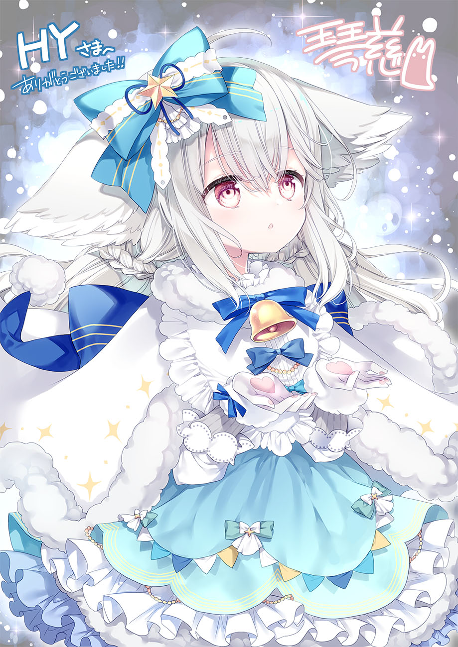 ahoge animal_ear_fluff animal_ears artist_name back_bow bell bib blue_bow blue_dress bow bowtie capelet collar commission dress facing_away fox_ears fox_girl fox_tail frilled_collar frilled_dress frills fur-trimmed_capelet fur-trimmed_dress fur-trimmed_gloves fur_trim gloves hair_between_eyes hair_bow hair_ornament hair_scrunchie hands_up high_collar highres kotoji large_bow large_ears large_tail layered_dress long_hair long_sleeves open_hands open_mouth original outstretched_hand parted_lips print_dress puffy_sleeves red_eyes sakurada_shiro_(hy_plus) sakurada_shiro_(winter)_(hy_plus) scrunchie signature star_(symbol) star_ornament star_symbol_background striped_clothes striped_dress tail thank_you upper_body vertical-striped_sleeves very_long_hair white_capelet white_footwear white_gloves white_hair white_sleeves winter_clothes