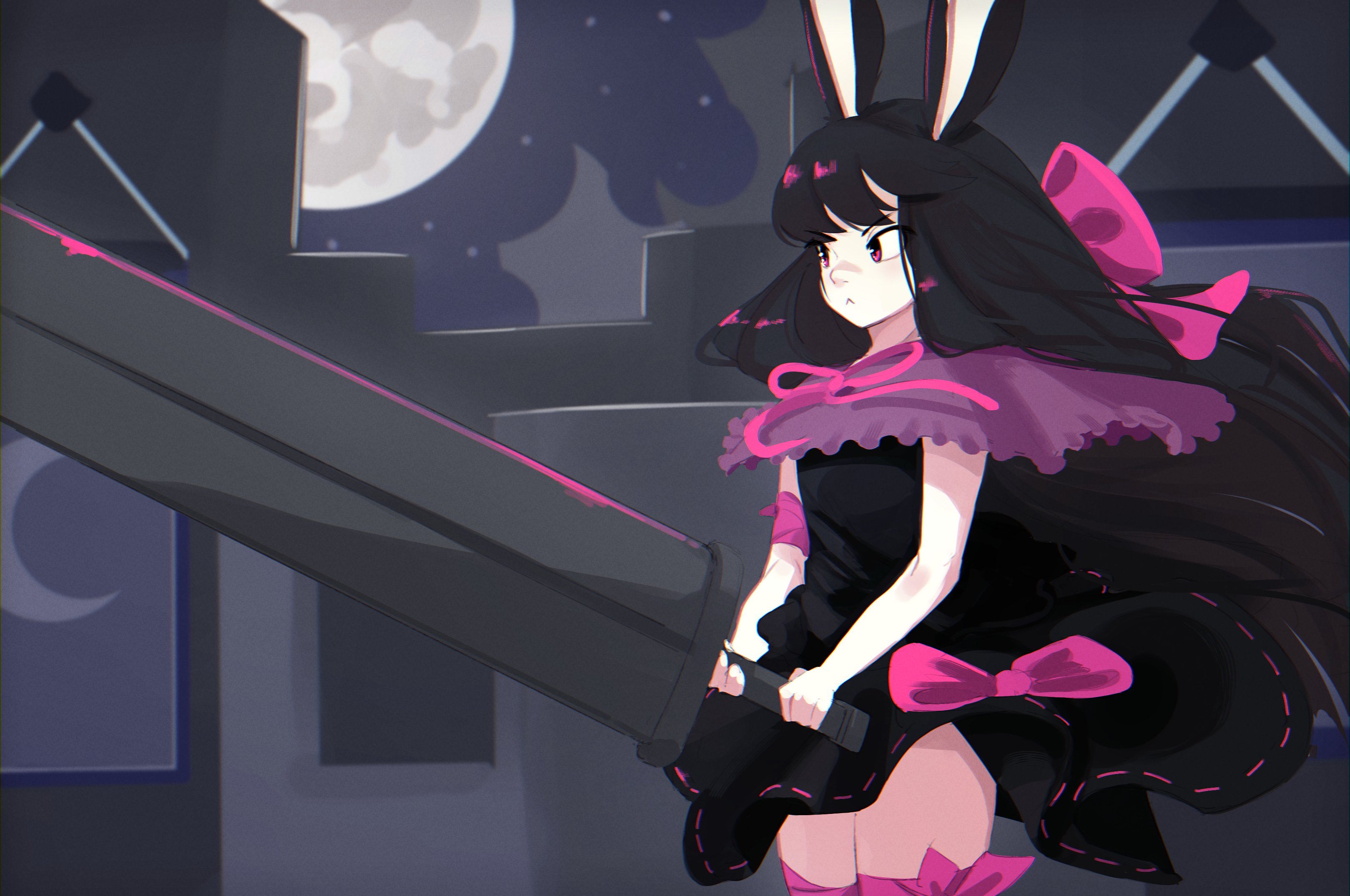 1girl :< absurdres animal_ears banner black_dress black_hair bow capelet closed_mouth commentary cowboy_shot dress english_commentary floating_hair full_moon greatsword hair_bow heavyblade_rabbit highres holding holding_sword holding_weapon long_hair looking_afar maishtar_colo moon neck_ribbon night outdoors pink_bow pink_eyes pink_ribbon purple_capelet rabbit_and_steel rabbit_ears rabbit_girl ribbon ribbon-trimmed_dress ribbon_trim solo sword v-shaped_eyebrows weapon