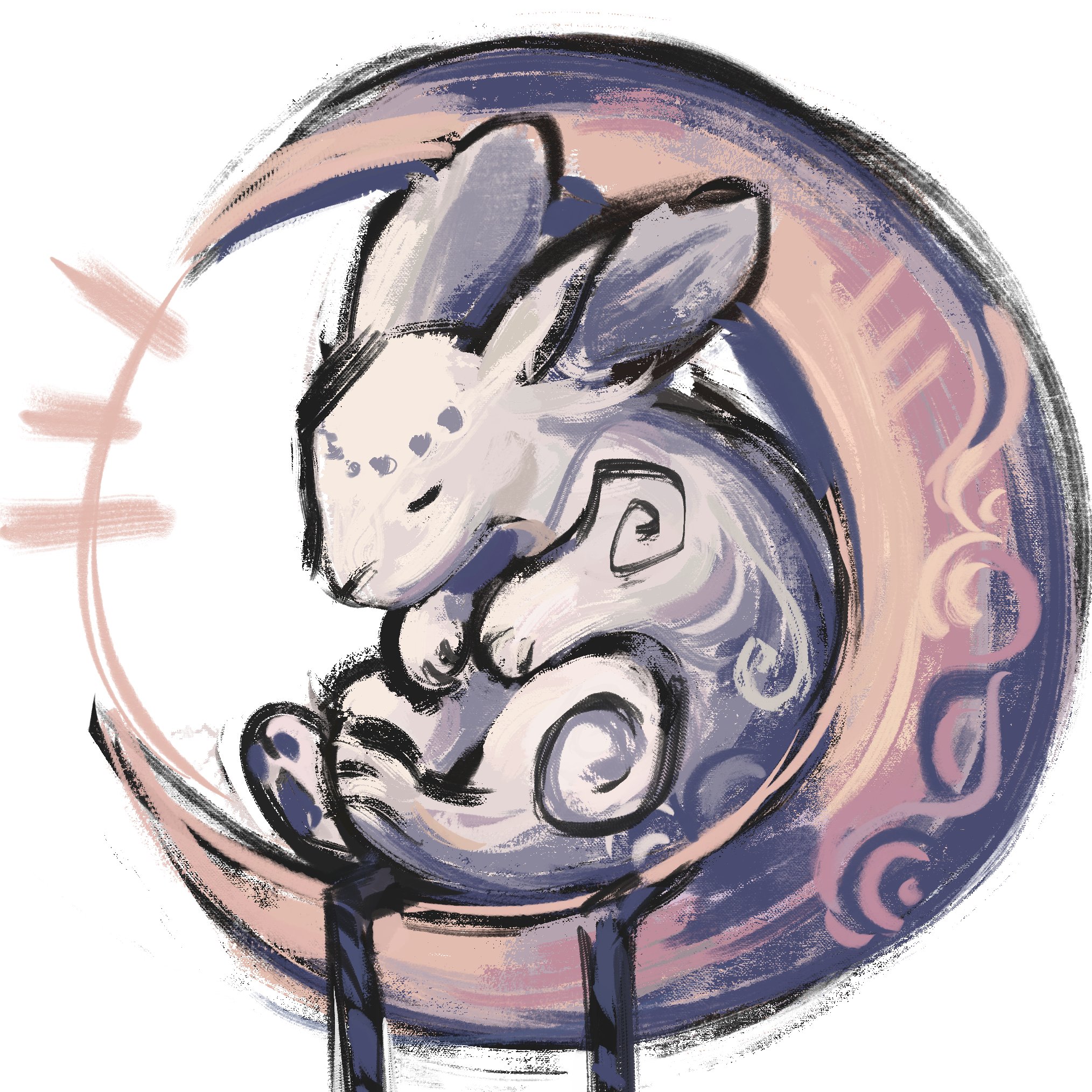 animal_focus closed_eyes commentary effie_(kerberosun) english_commentary full_body highres no_humans on_crescent painterly rabbit rabbit_and_steel rabbit_of_the_moon_shira simple_background solo white_background