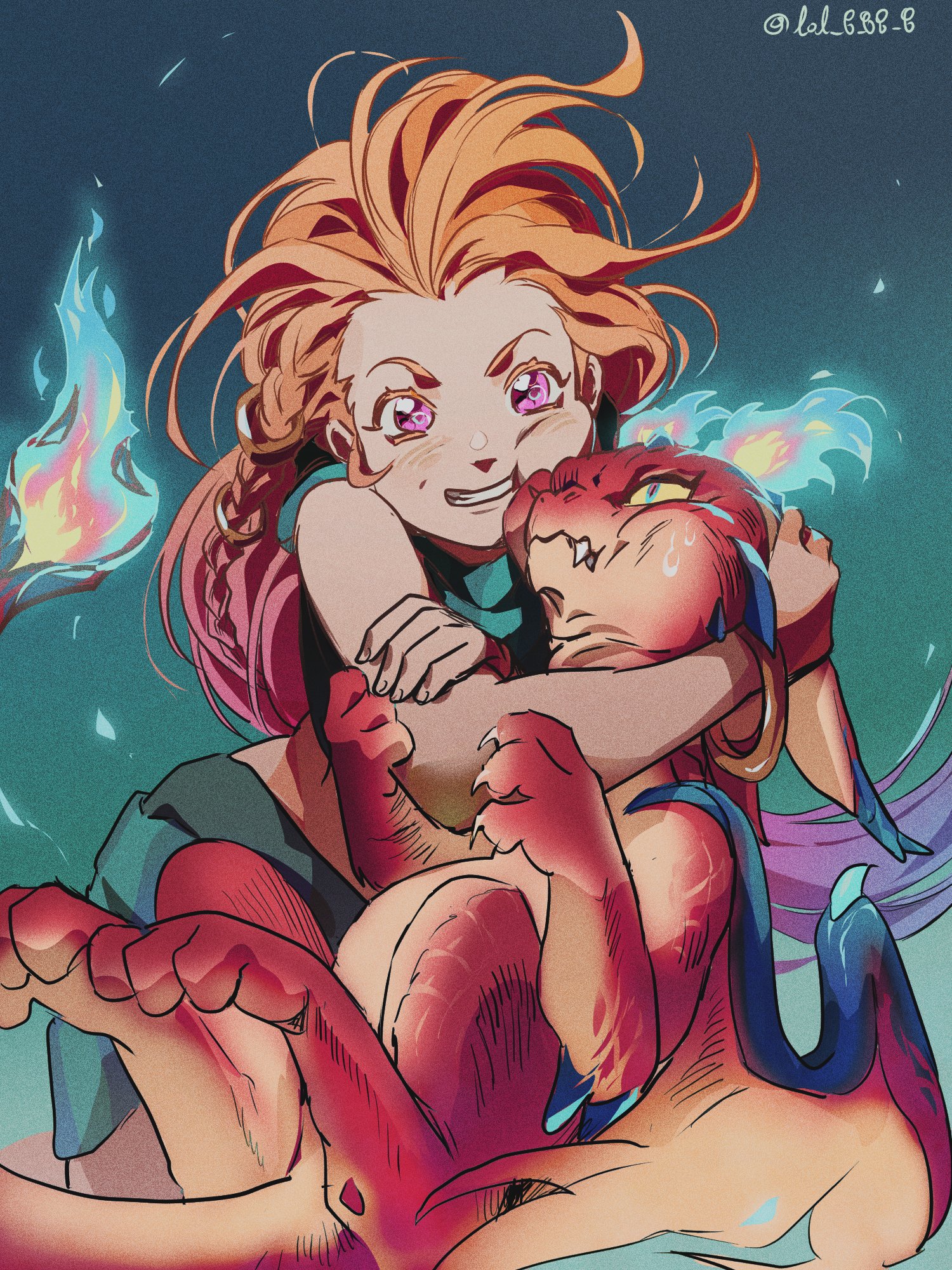 1girl artist_name blush bracelet braid clenched_teeth cowboy_shot dragon fingernails highres hug jewelry league_of_legends lolbun8888 looking_at_viewer multicolored_hair orange_hair pink_hair purple_eyes purple_hair side_braid simple_background smile smolder_(league_of_legends) sweatdrop teeth zoe_(league_of_legends)