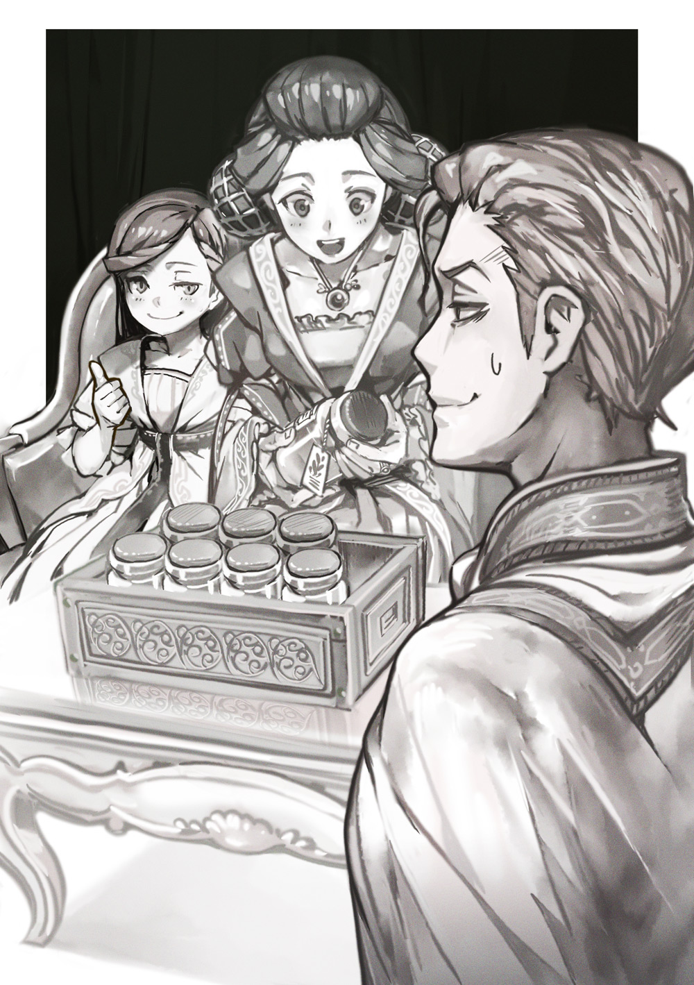 1boy 2girls :d benno_(honzuki_no_gekokujou) box couch double_bun dress elvira_(honzuki_no_gekokujou) forced_smile greyscale hair_bun hair_slicked_back highres holding holding_jar honzuki_no_gekokujou jar kousaku monochrome multiple_girls myne_(honzuki_no_gekokujou) open_mouth sitting smile smug sweatdrop table thumbs_up