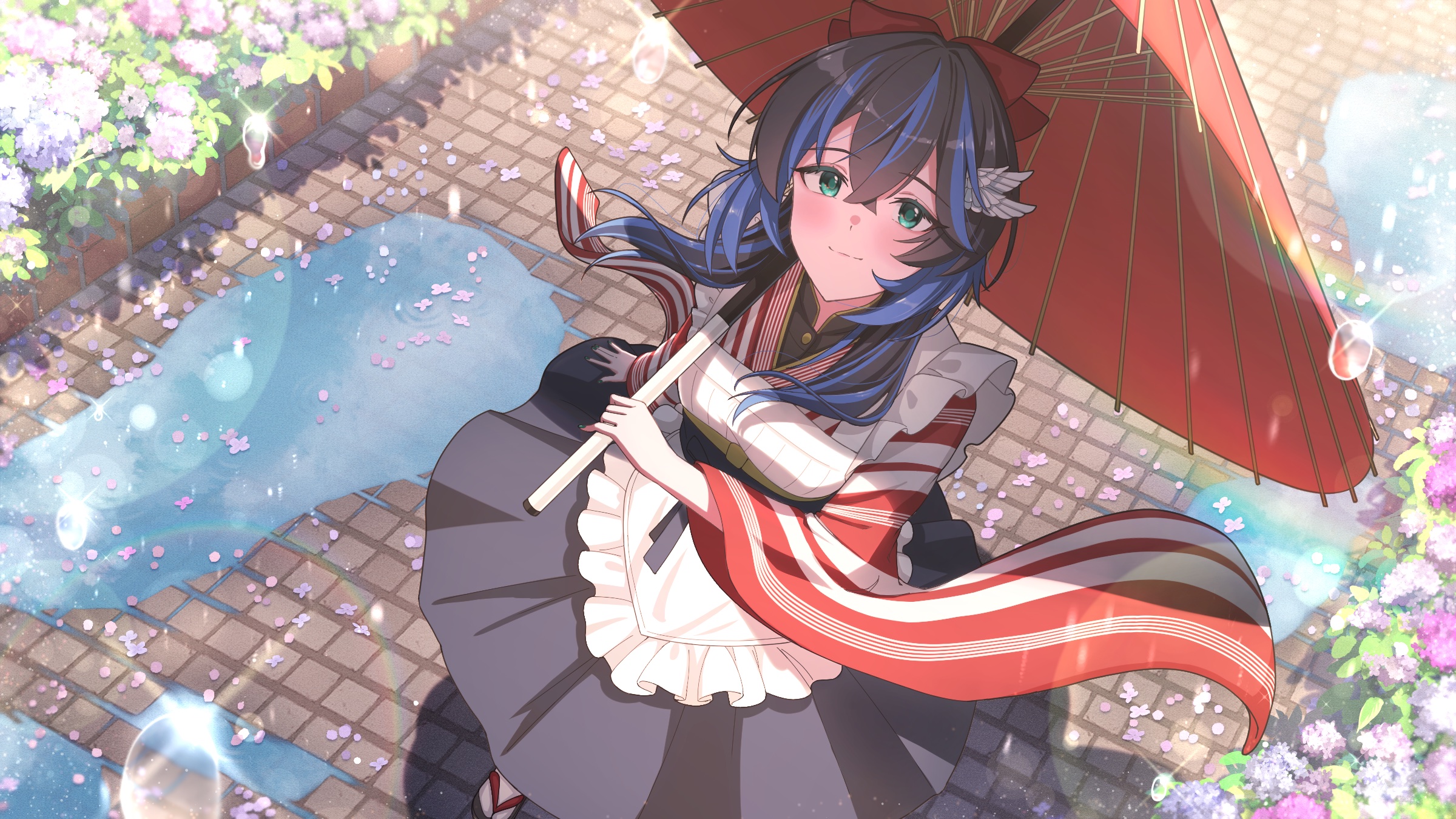 1girl apron black_dress black_hair bow closed_mouth dress flower from_above green_eyes hair_between_eyes hair_ornament highres holding holding_umbrella japanese_clothes maid oil-paper_umbrella original outdoors puddle red_bow sandals sassakntm socks solo umbrella wa_maid water_drop white_apron white_socks wide_sleeves wing_hair_ornament