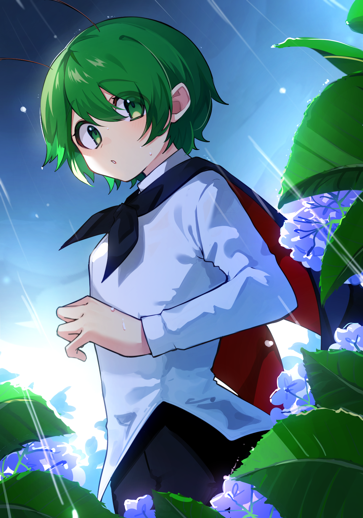 1girl antennae black_cape black_shorts blush cape cowboy_shot flower green_eyes green_hair hair_between_eyes highres long_sleeves looking_at_viewer purple_flower rain shirt short_hair shorts solo touhou tsumikitsuki_(katsuobushi) white_shirt wriggle_nightbug