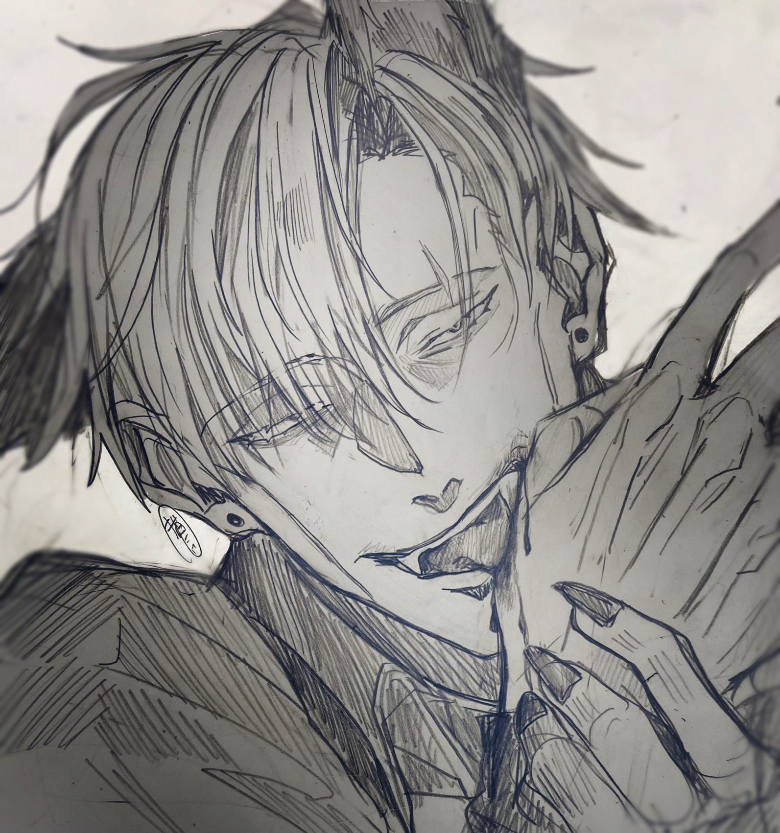 animal_ears blood earrings fangs fingernails greyscale highres injury jewelry jujutsu_kaisen licking long_fingernails male_focus monochrome nanami_kento nekonii open_mouth portrait short_hair sketch teeth tongue upper_teeth_only wolf_boy wolf_ears