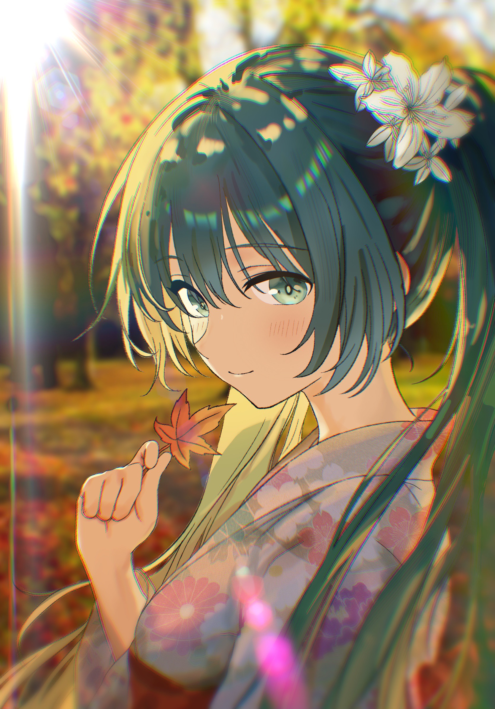 1girl autumn autumn_leaves breasts floral_print floral_print_kimono flower from_side green_eyes green_hair hair_between_eyes hair_flower hair_ornament hatsune_miku highres holding holding_leaf japanese_clothes kimono leaf lens_flare light_blush looking_at_viewer looking_to_the_side maple_leaf medium_breasts outdoors pink_kimono print_kimono procreate_(medium) sideways_glance smile solo tree upper_body vocaloid white_flower zeniaguan