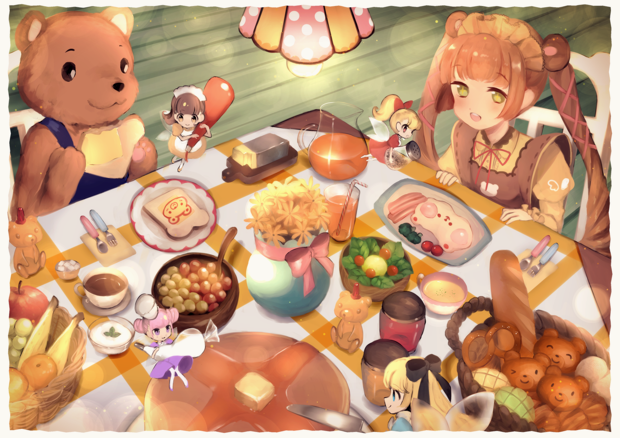 5girls :d alice's_adventures_in_wonderland animal_ears animal_print apple apron bacon baguette banana basket bear bear_ears bear_print black_bow blonde_hair blue_dress blue_eyes blurry blush bokeh bow bread broccoli brown_hair brown_overalls butter chef_hat cherry_tomato chibi cup depth_of_field dot_nose double_bun dress drinking_straw egg fairy_wings flower food food_focus fork frilled_sleeves frills fruit grapes green_eyes hair_bow hair_bun hair_ribbon hat highres holding holding_knife holding_pastry_bag holding_shaker honey jar juice ketchup knife lamp long_sleeves lushuao maid_headdress melon_bread multiple_girls napkin open_mouth orange_(fruit) orange_dress orange_eyes orange_juice original overalls pancake pastry_bag pepper_shaker pink_bow pink_hair pink_ribbon pitcher_(container) ponytail pretzel puffy_long_sleeves puffy_sleeves purple_dress purple_eyes red_bow red_dress red_ribbon ribbon salad shirt smile spoon sugar_cube teacup tomato twintails vase white_apron wings yellow_eyes yellow_flower yellow_shirt