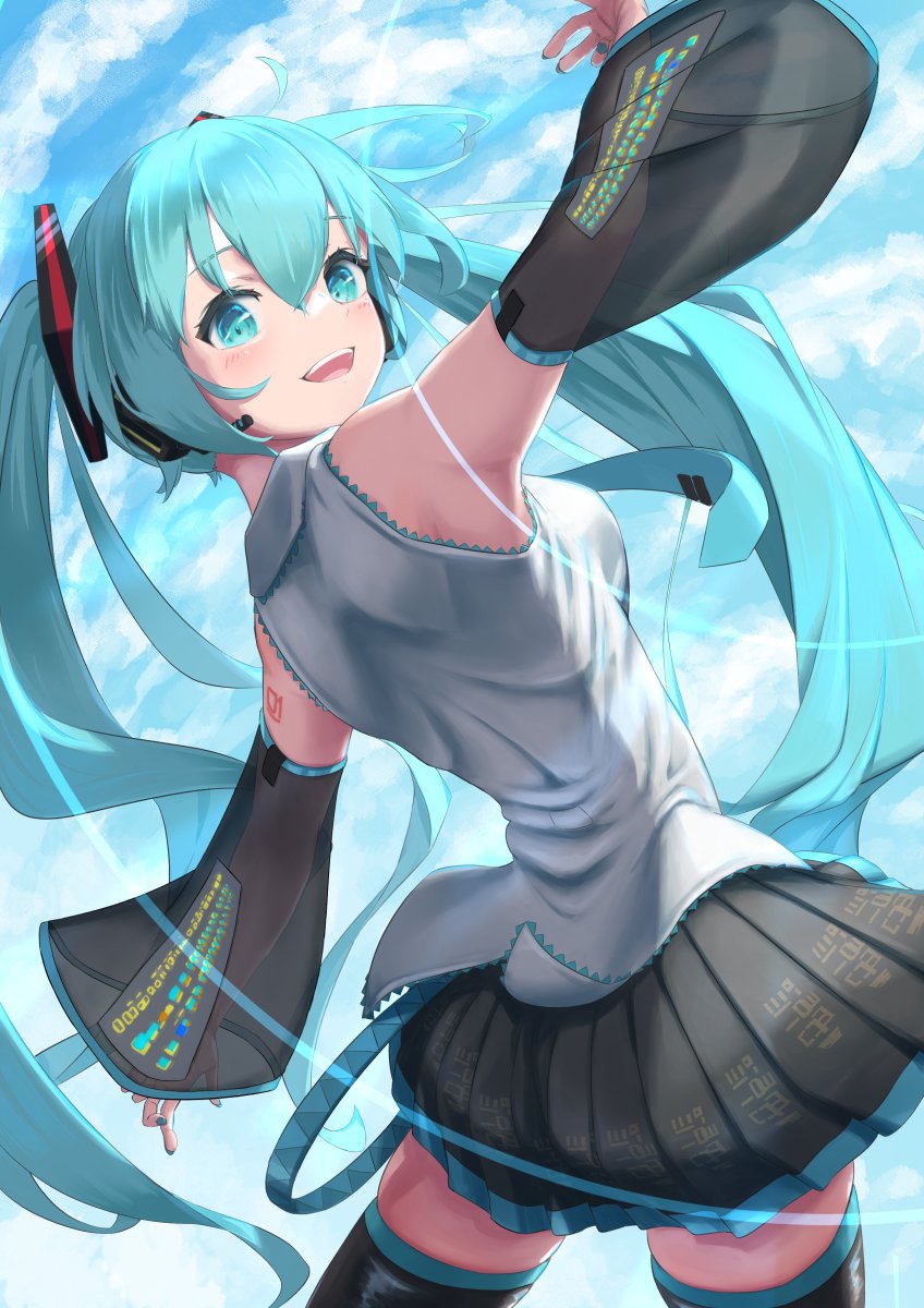 1girl aqua_eyes aqua_hair aqua_necktie blue_eyes blue_hair commentary cowboy_shot detached_sleeves from_behind hatsune_miku headphones headset highres light_blue_hair long_hair looking_at_viewer looking_back necktie number_tattoo pleated_skirt skirt tattoo twintails vocaloid yukichi_(yu-ame)