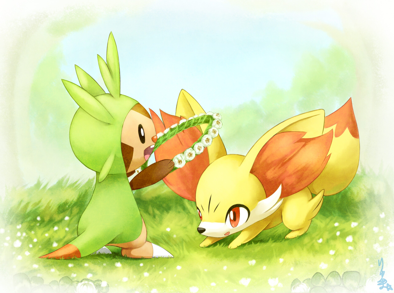 black_eyes chespin claws fennekin flower gen_6_pokemon grass holding nintendo no_humans open_mouth orange_eyes pokemon pokemon_(creature) ryuma210 signature standing
