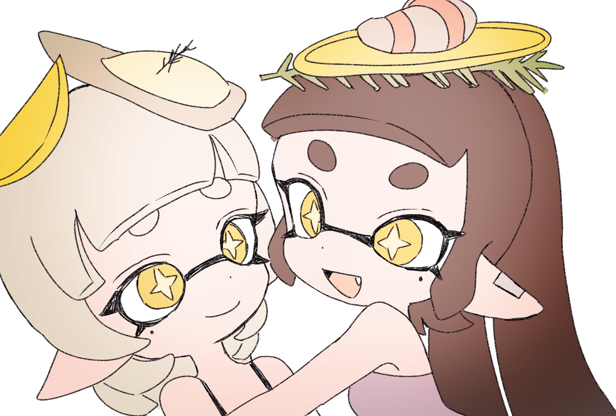 2girls :d bare_shoulders callie_(splatoon) callie_(summer_nights)_(splatoon) closed_mouth cousins cross-shaped_pupils dot_nose fang food food_on_head fruit grey_hair highres lemon lemon_slice long_hair marie_(splatoon) marie_(summer_nights)_(splatoon) mole mole_under_eye multiple_girls nintendo object_on_head official_alternate_costume open_mouth oyster plum0o0 pointy_ears short_eyebrows short_hair simple_background smile splatoon_(series) splatoon_3 suspenders symbol-shaped_pupils tentacle_hair white_background yellow_eyes