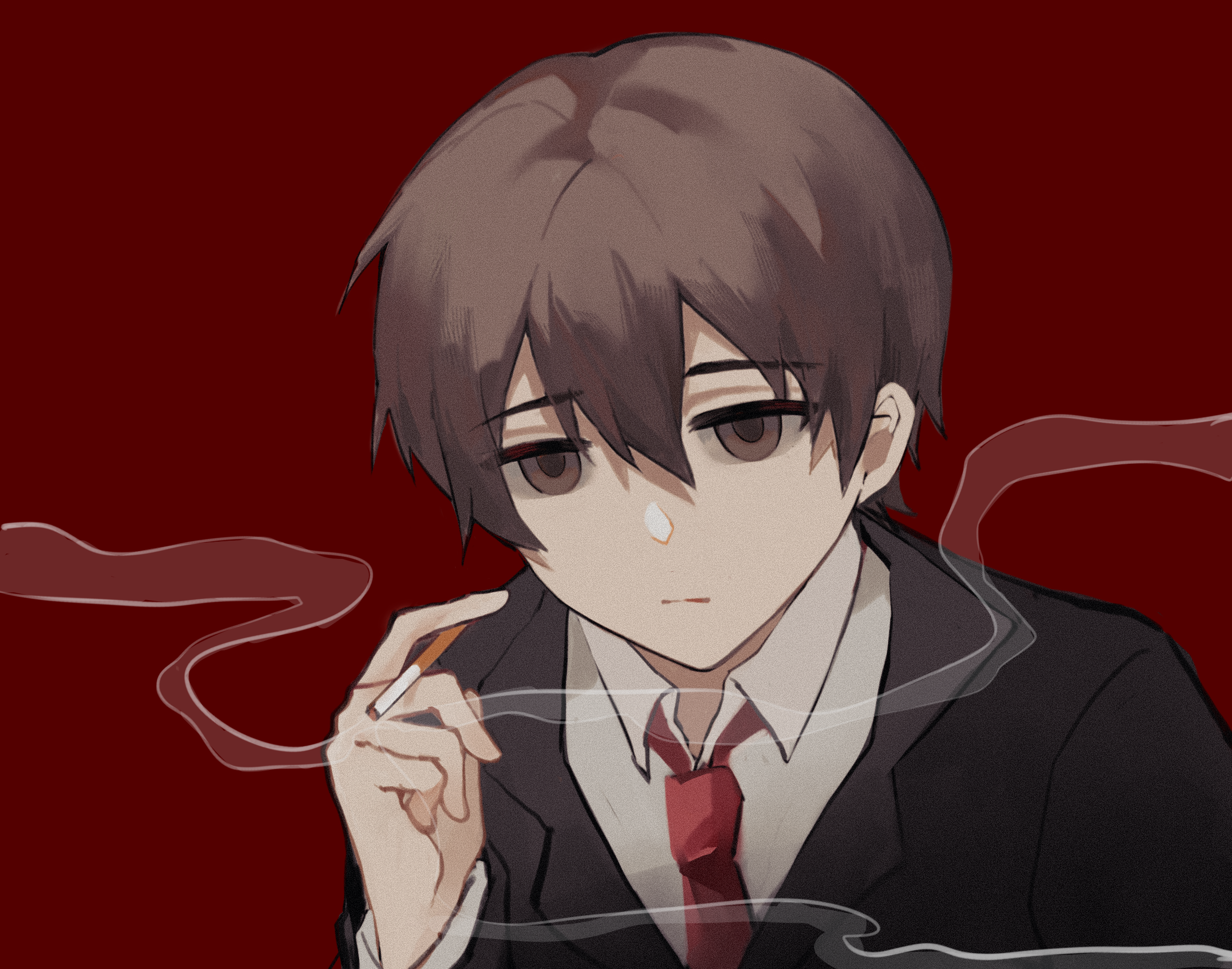 1boy black_jacket brown_eyes brown_hair chinese_commentary cigarette closed_mouth collared_shirt commentary_request empty_eyes film_grain hair_between_eyes highres holding holding_cigarette jabuchi_you jacket long_sleeves male_focus necktie niwatari_(xtgydl) red_background red_necktie saibou_shinkyoku shirt short_hair simple_background smoke solo white_shirt