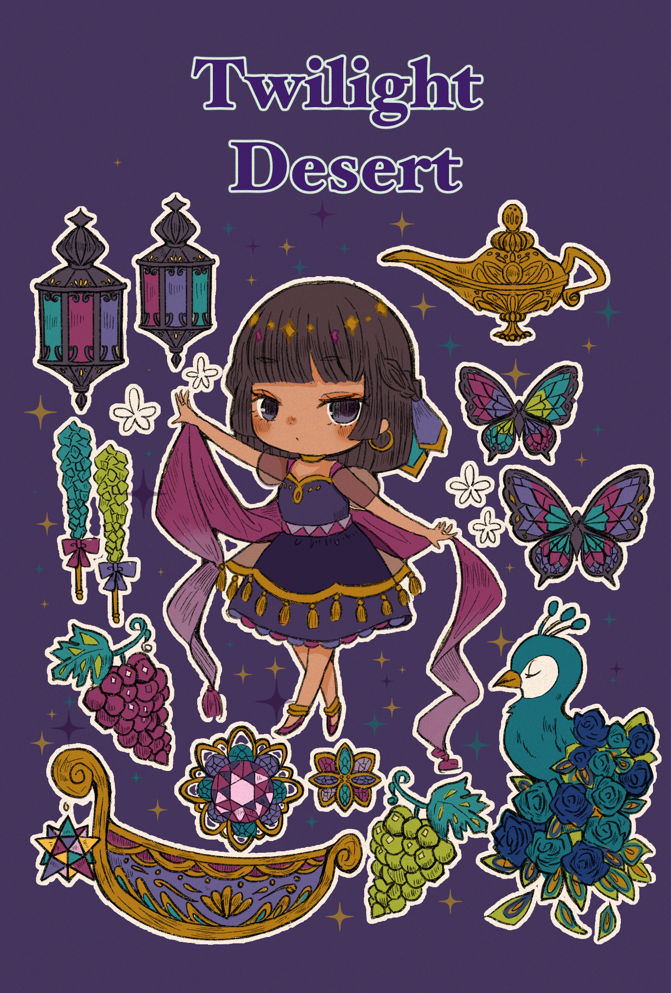 1girl anklet bird brown_hair bug butterfly cerika closed_mouth dot_mouth dress earrings english_text food fruit full_body gem grapes highres hoop_earrings insect jewelry oil_lamp original outline peacock peafowl purple_background purple_dress purple_eyes solo sparkle white_outline