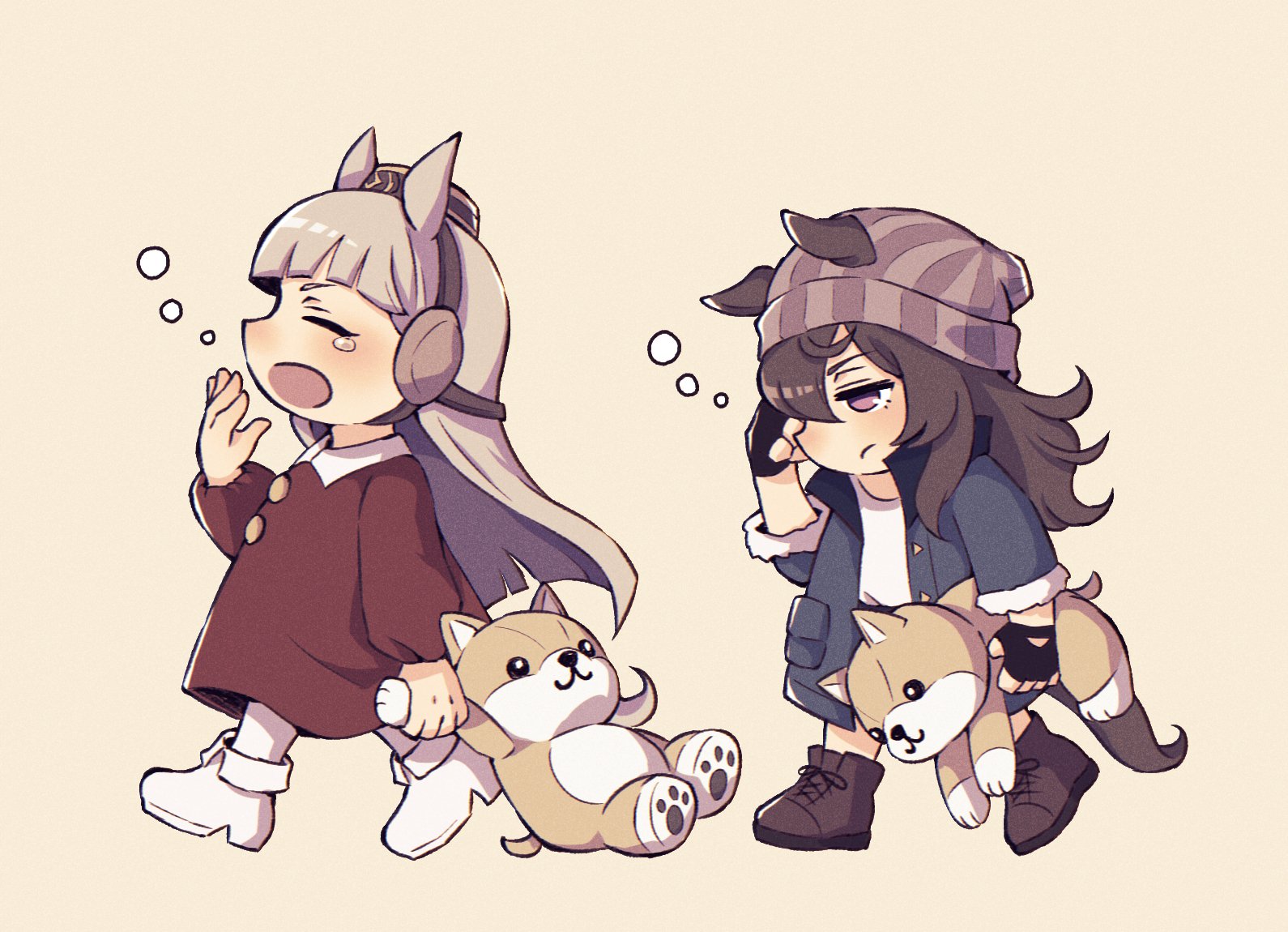 2girls animal_ears beanie black_jacket blush boots brown_background brown_dress brown_footwear brown_hair brown_hat chibi closed_mouth collared_dress commentary_request dress ear_covers ears_through_headwear fur-trimmed_sleeves fur_trim gold_ship_(umamusume) grey_hair grey_hat hair_between_eyes hat holding holding_stuffed_toy horse_ears horse_girl horse_tail jacket lace-up_boots long_hair long_sleeves mini_hat multiple_girls nakayama_festa_(umamusume) namuko open_clothes open_jacket open_mouth pantyhose puffy_long_sleeves puffy_sleeves purple_eyes rubbing_eyes shirt simple_background stuffed_animal stuffed_dog stuffed_toy tail tears umamusume umamusume:_peace_peace_cepea_cepea_golshi-chan very_long_hair walking white_footwear white_pantyhose white_shirt yawning