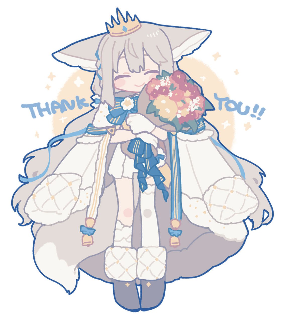 ^_^ animal_ear_fluff animal_ears ascot asymmetrical_legwear blue_bow blue_ribbon blue_sash boots bouquet bow bowtie brown_boots chibi closed_eyes coat coat_on_shoulders commission crown flower fox_ears fox_girl fox_tail frilled_vest frills full_body fur-trimmed_boots fur-trimmed_coat fur_trim gloves grey_hair hair_between_eyes hair_bow hair_ornament hair_ribbon hair_scrunchie hands_up high_collar highres holding holding_bouquet large_ears large_tail long_hair looking_at_viewer low_twintails nonaprev original red_eyes ribbon rose sakurada_shiro_(hy_plus) sakurada_shiro_(royal)_(hy_plus) sash scrunchie shoulder_sash simple_background single_bare_leg single_sock skeb_commission smile socks standing straight-on tail thank_you thighhighs twintails uneven_legwear very_long_hair vest white_background white_coat white_flower white_gloves white_hair white_rose white_socks white_thighhighs white_unitard zettai_ryouiki