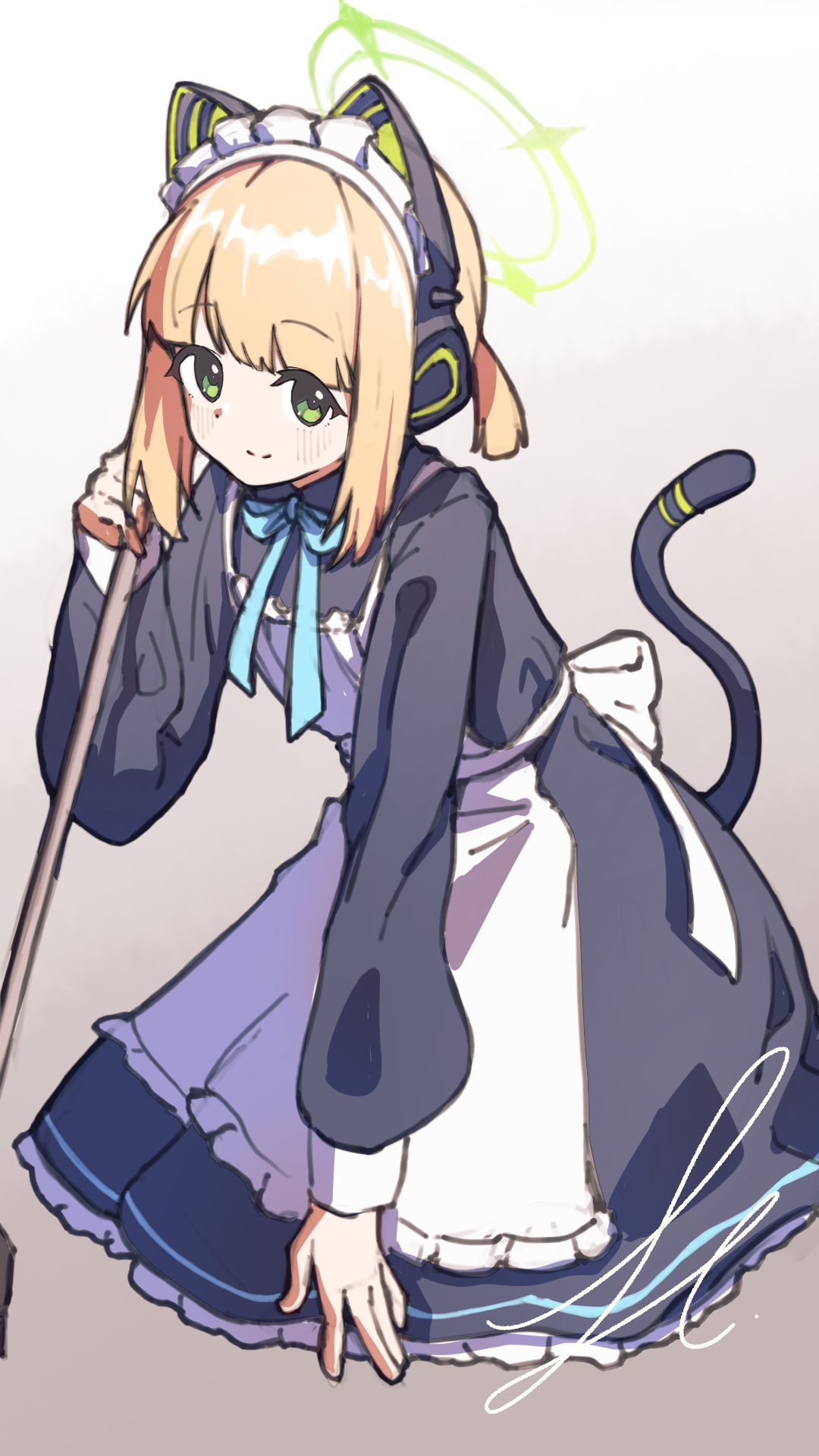 1girl animal_ears aoi_hinata_v apron black_dress blonde_hair blue_archive blue_bow bow cat_ears cat_tail closed_mouth dress fake_animal_ears fake_tail frilled_dress frills green_eyes green_halo halo headphones highres holding holding_mop looking_at_viewer maid maid_apron maid_headdress medium_hair midori_(blue_archive) midori_(maid)_(blue_archive) mop seiza sidelocks signature simple_background sitting sketch smile tail white_apron white_background
