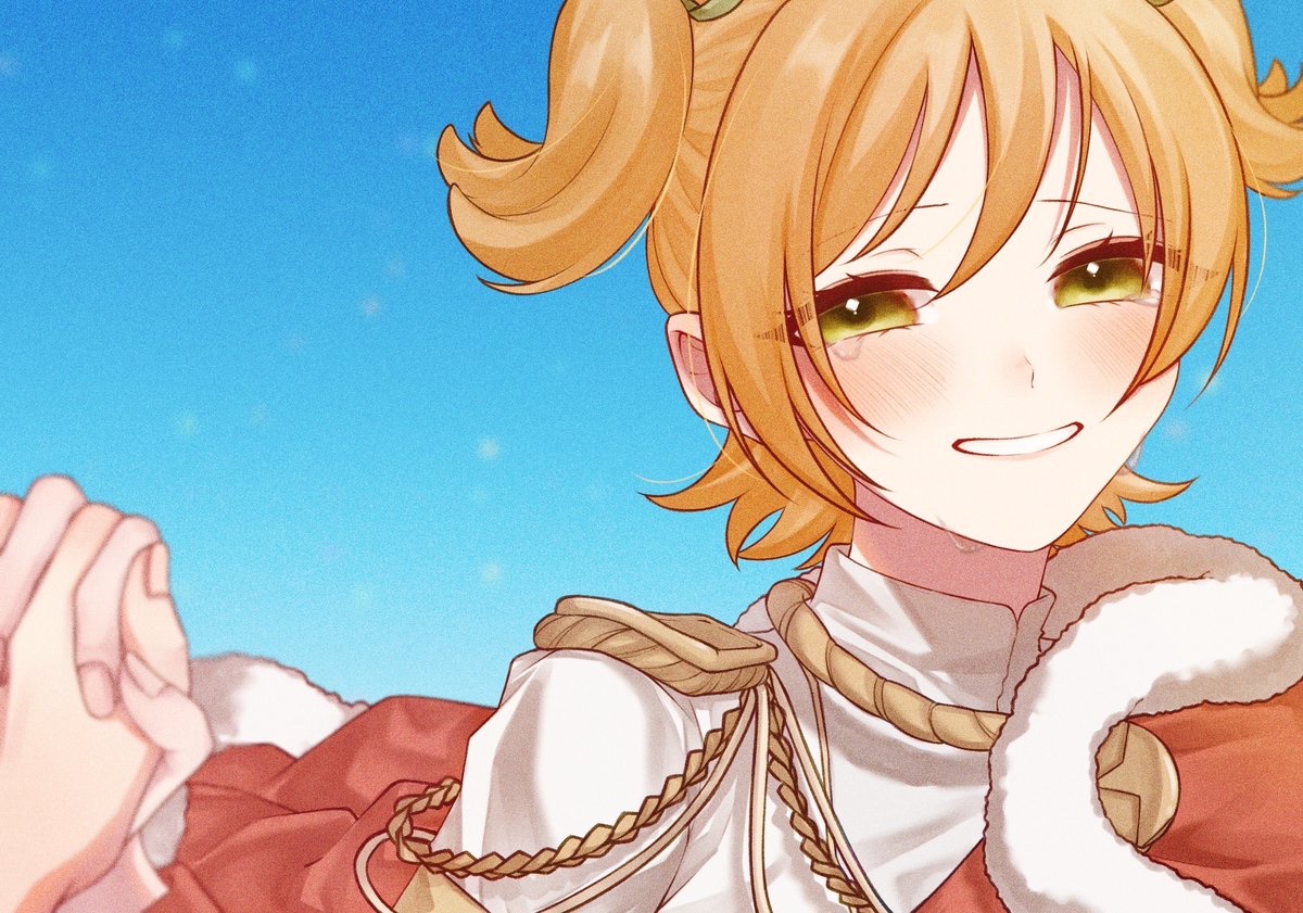 2girls aiguillette blonde_hair blue_sky blurry blurry_foreground blush chocomint_1031 commentary crying crying_with_eyes_open daiba_nana day depth_of_field epaulettes fingernails fur-trimmed_jacket fur_trim green_eyes green_ribbon grin hair_between_eyes hair_ribbon half-closed_eyes hand_up holding_hands hoshimi_junna interlocked_fingers jacket jacket_on_shoulders long_sleeves looking_at_viewer multiple_girls out_of_frame outdoors parted_lips red_jacket red_sash ribbon sash short_hair short_twintails shoujo_kageki_revue_starlight shoulder_sash sky smile solo_focus tears twintails white_jacket