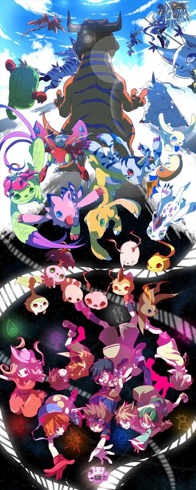3girls 5boys agumon angemon bird birdramon bug cat crests_(digimon) digimon digimon_(creature) gabumon garurumon glasses gomamon greymon highres ikkakumon ishida_yamato izumi_koshiro kabuterimon kido_jo koromon mochimon multiple_boys multiple_girls nyaromon palmon patamon piyomon plotmon pukamon pyocomon reptile tachikawa_mimi tailmon takaishi_takeru takenouchi_sora tanemon tentomon togemon tokomon tunomon wings yagami_hikari yagami_taichi