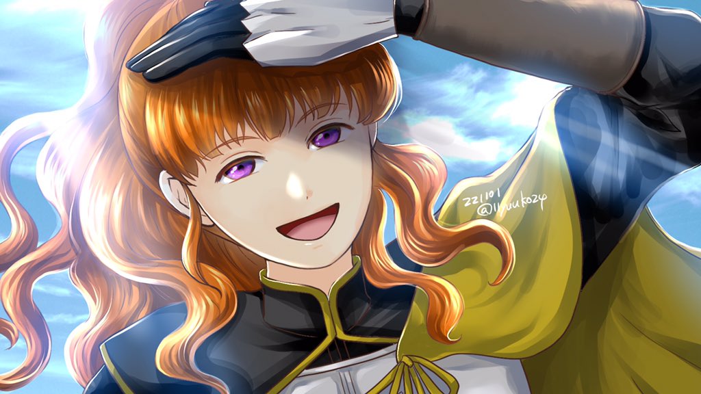 1girl :d cape dated day gloves hand_up honzuki_no_gekokujou judithe_(honzuki_no_gekokujou) long_hair open_mouth orange_hair purple_eyes school_uniform sidelocks smile solo sunlight wavy_hair yellow_cape yuuko24