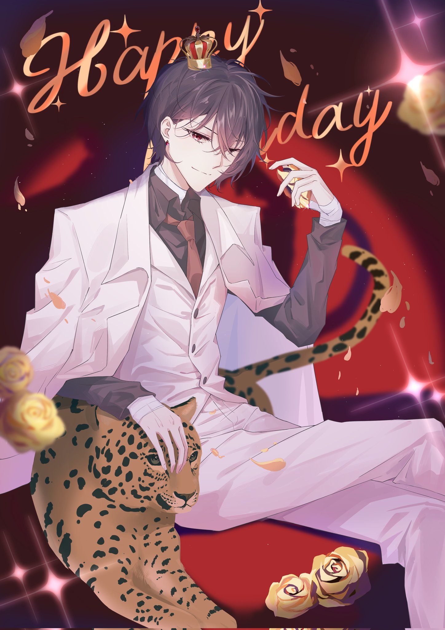 1boy alternate_hairstyle brown_eyes brown_hair bungou_stray_dogs crown dazai_osamu_(bungou_stray_dogs) flower happy_birthday highres jaguar male_focus official_alternate_costume zbcbjf