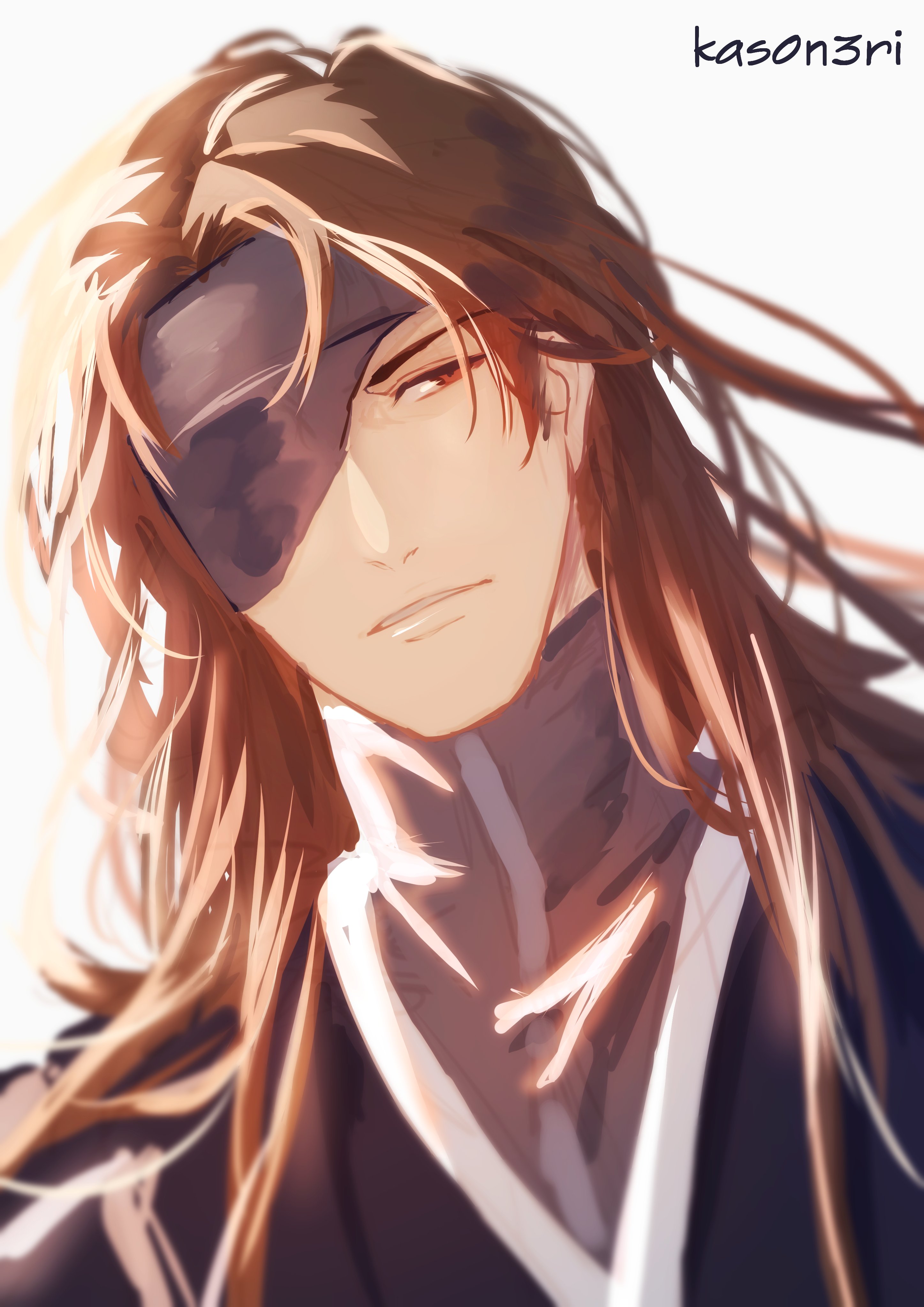 1boy absurdres aizen_sousuke black_kimono bleach bleach:_sennen_kessen-hen brown_eyes brown_hair close-up closed_mouth commentary dutch_angle english_commentary eyepatch highres japanese_clothes kas0n3ri kimono long_hair looking_to_the_side male_focus mature_male one_eye_covered parted_lips sketch solo twitter_username