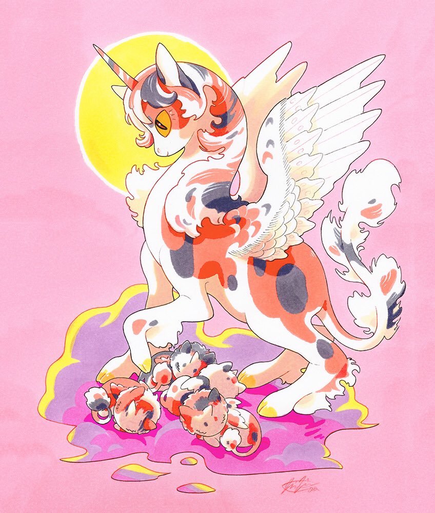 5others animal animal_ears animal_focus baby_animal calico_(pattern) cat cat_ears colored_eyelashes colored_sclera creature creature_focus curled_up feathered_wings feathers fleebites grey_fur grey_hair hooves horns kitten leg_up lying mother_and_child multicolored_tail multiple_others no_humans on_cloud orange_eyes orange_fur orange_hair original parent_and_child pink_background pink_clouds profile signature simple_background single_horn sleeping sun tail unicorn white_eyelashes white_feathers white_fur white_hair white_wings winged_unicorn wings yellow_light yellow_sclera