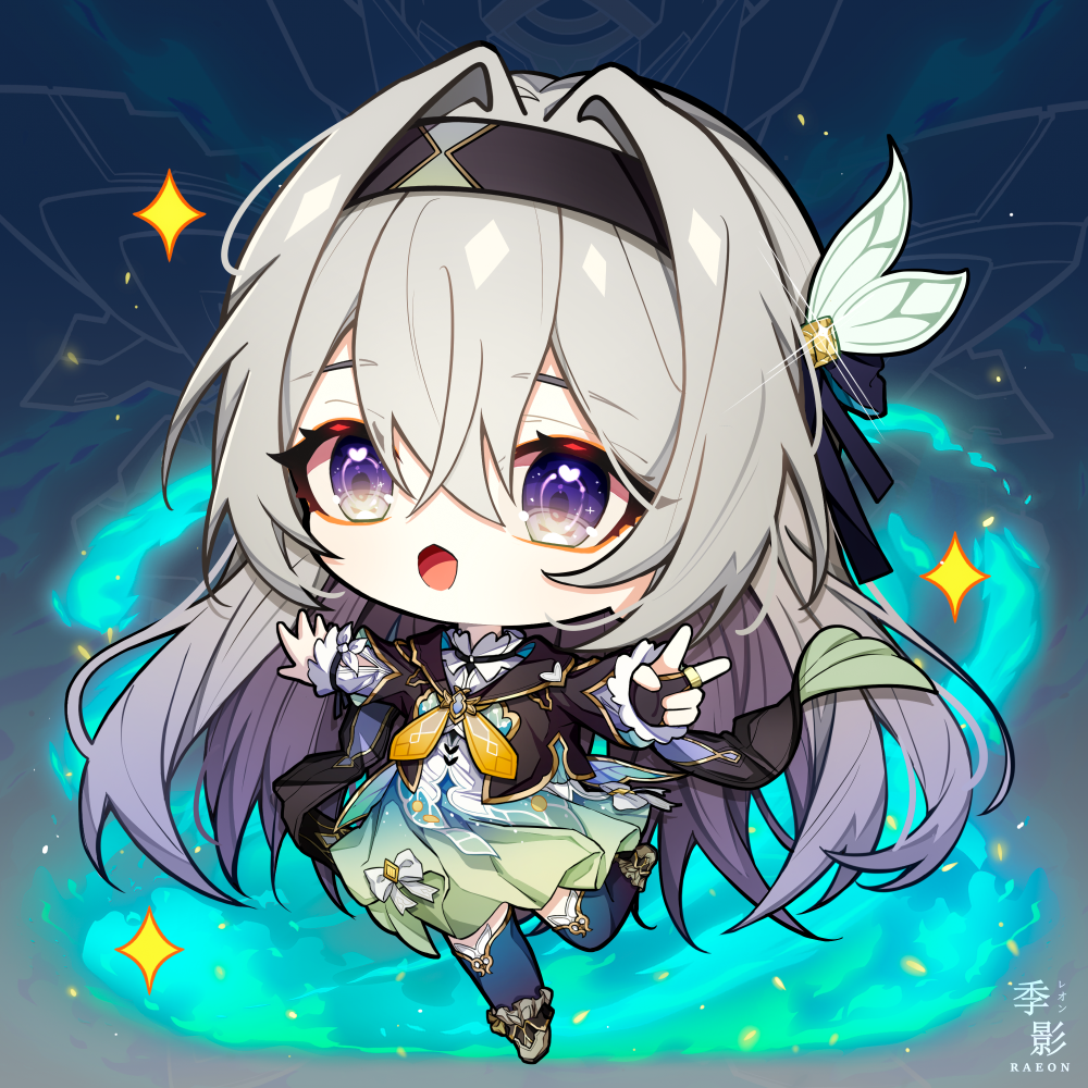 1girl aqua_skirt aqua_thighhighs black_bridal_gauntlets black_hairband black_jacket bridal_gauntlets chestnut_mouth chibi cropped_jacket firefly_(honkai:_star_rail) grey_hair hair_between_eyes hair_ornament hairband honkai:_star_rail honkai_(series) jacket long_hair long_sleeves looking_at_viewer multicolored_eyes open_mouth raxa9501 shirt single_bridal_gauntlet skirt solo standing standing_on_one_leg thighhighs white_footwear white_shirt