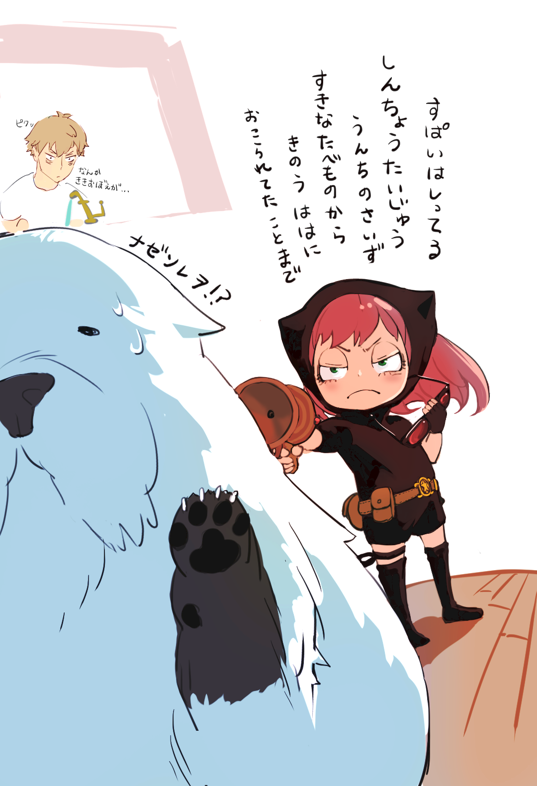 1boy 1girl aiming anya_(spy_x_family) belt blonde_hair bond_(spy_x_family) check_translation commentary_request dog faucet fingerless_gloves gloves green_eyes gun hat higemu highres holding holding_gun holding_removed_eyewear holding_weapon partially_translated pink_hair pouch spy_x_family sunglasses sweat thighhighs translation_request twilight_(spy_x_family) unworn_eyewear weapon
