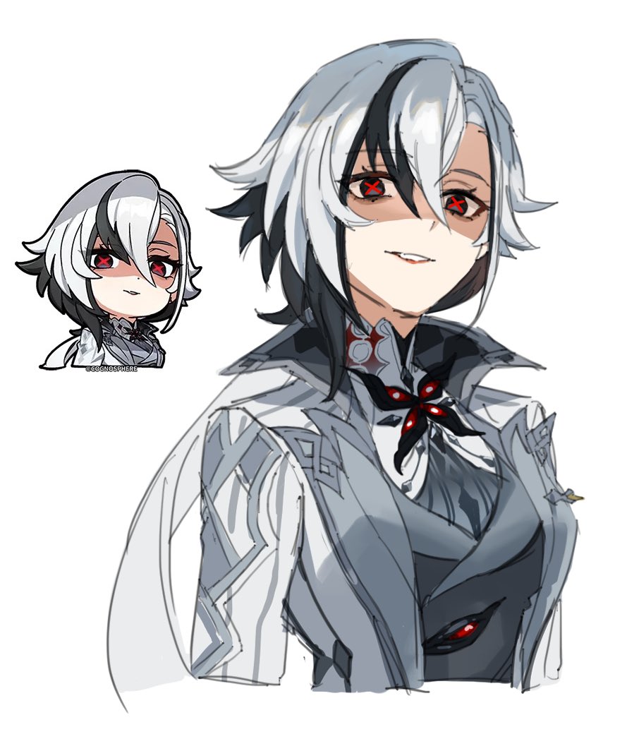 1girl arlecchino_(genshin_impact) black_eyes bright_pupils cropped_torso derivative_work genshin_impact hoyolab_sticker_redraw jacket long_hair looking_at_viewer low_ponytail multicolored_hair official_art_inset parted_lips ponytail red_pupils reference_inset screenshot_redraw shaded_face simple_background solo streaked_hair symbol-shaped_pupils two-tone_hair upper_body white_background white_hair white_jacket x-shaped_pupils yamabuki0211