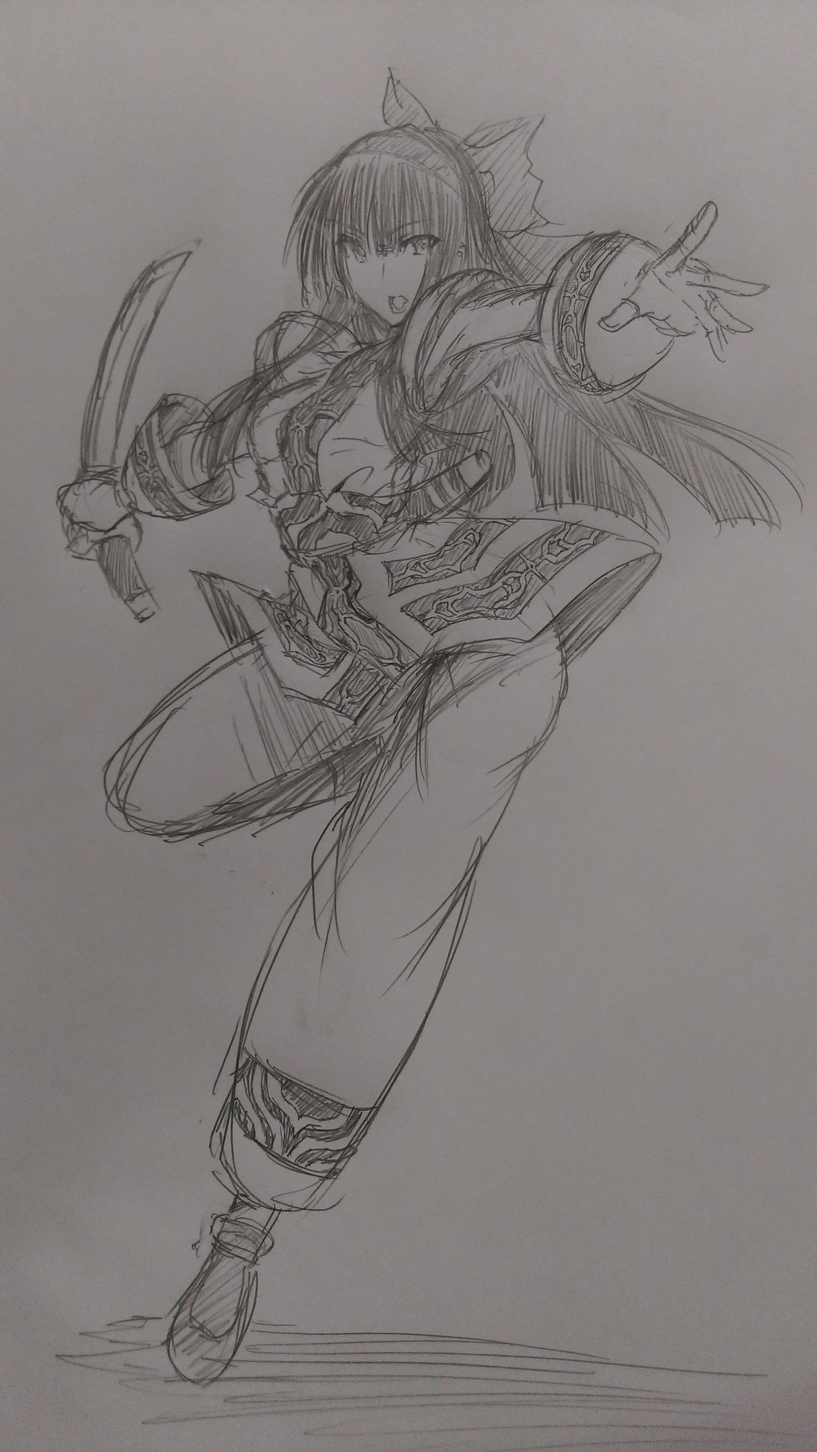 1girl ainu_clothes akenami_yasutaka armpits breasts fingerless_gloves gloves hair_ribbon highres leg_lift leg_up legs long_hair looking_at_viewer medium_breasts monochrome nakoruru outstretched_arm pants ribbon samurai_spirits sketch snk solo the_king_of_fighters the_king_of_fighters_xiv thighs traditional_media weapon