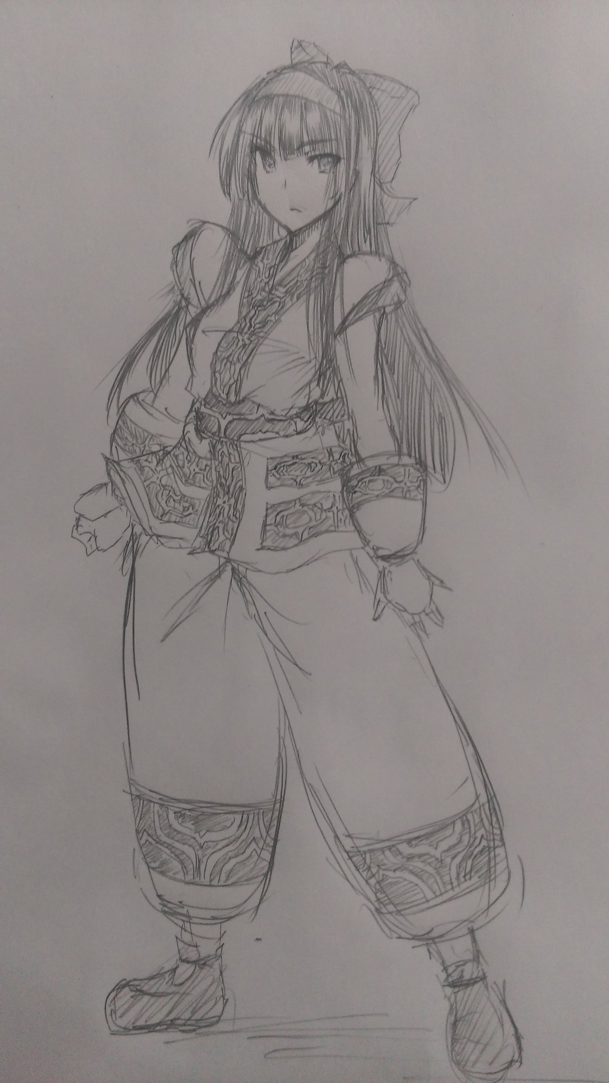 1girl ainu_clothes akenami_yasutaka breasts fingerless_gloves gloves hair_ribbon highres legs long_hair looking_at_viewer medium_breasts monochrome nakoruru pants ribbon samurai_spirits serious sketch snk solo the_king_of_fighters the_king_of_fighters_xiv thighs traditional_media weapon