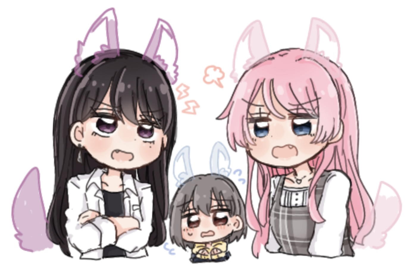 3girls bang_dream! bang_dream!_it's_mygo!!!!! black_shirt blue_eyes blush brown_hair chihaya_anon commentary_request drawn_ears drawn_tail dress earrings fang flying_sweatdrops grey_dress grey_hair jewelry lightning_bolt_symbol long_hair looking_at_another mole mole_under_eye multiple_girls open_clothes open_mouth open_shirt pinafore_dress pink_hair purple_eyes red_eyes same_(same_d4) shiina_taki shirt short_hair simple_background sleeveless sleeveless_dress takamatsu_tomori upper_body white_background white_shirt