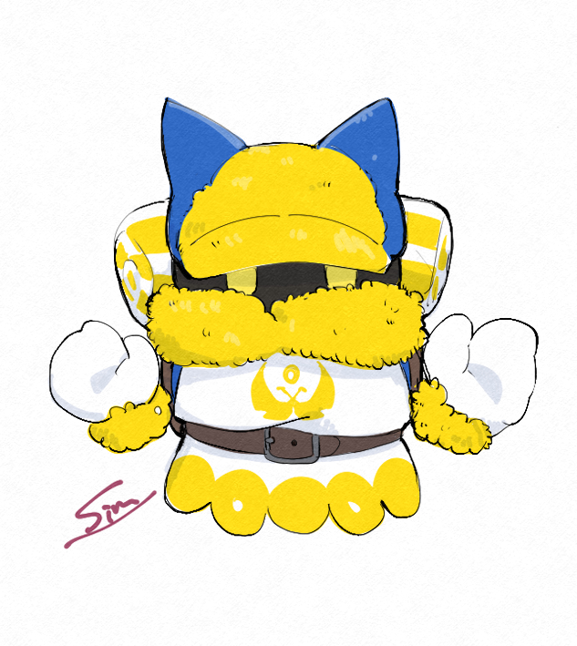 1boy backpack bag belt cosplay ginkgo_guild_uniform kirby_(series) looking_at_viewer magolor male_focus nintendo pokemon pokemon_legends:_arceus rayman_limbs signature simon_(kabo_chips) simple_background solo volo_(pokemon) volo_(pokemon)_(cosplay) white_background yellow_eyes