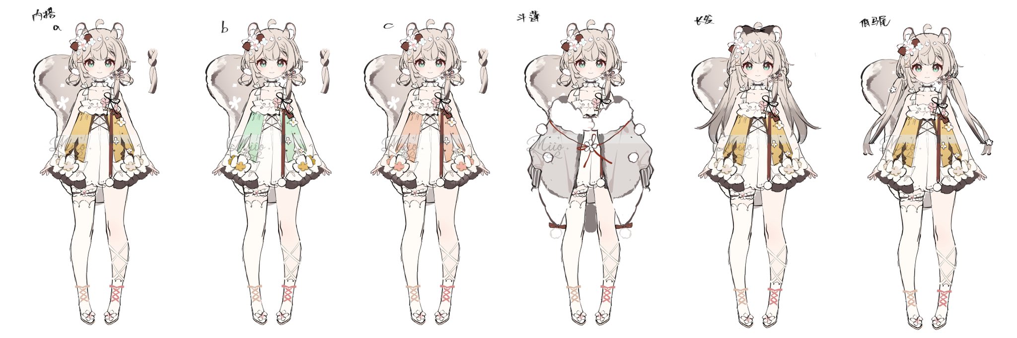 1girl ahoge animal_ear_fluff animal_ears ankle_socks arin_(fanfan013) asymmetrical_legwear bare_arms bare_shoulders black_bow black_choker blue_eyes bow braid brown_hair brown_poncho chinese_commentary chinese_text choker closed_mouth commentary_request double_bun dress eyelashes flower footwear_flower frilled_choker frilled_thigh_strap frills full_body fur-trimmed_poncho gradient_hair hair_bow hair_bun hair_flower hair_ornament highres leg_ribbon light_blush long_hair looking_at_viewer low_twintails mismatched_legwear multicolored_hair original pom_pom_(clothes) pom_pom_hair_ornament red_bow reference_sheet ribbon shoes short_dress short_hair side_braids simple_background single_sock single_thighhigh sleeveless sleeveless_dress smile socks squirrel_ears squirrel_tail standing straight-on tail thigh_strap thighhighs translation_request twintails variations white_background white_bow white_dress white_flower white_footwear white_ribbon white_socks white_thighhighs