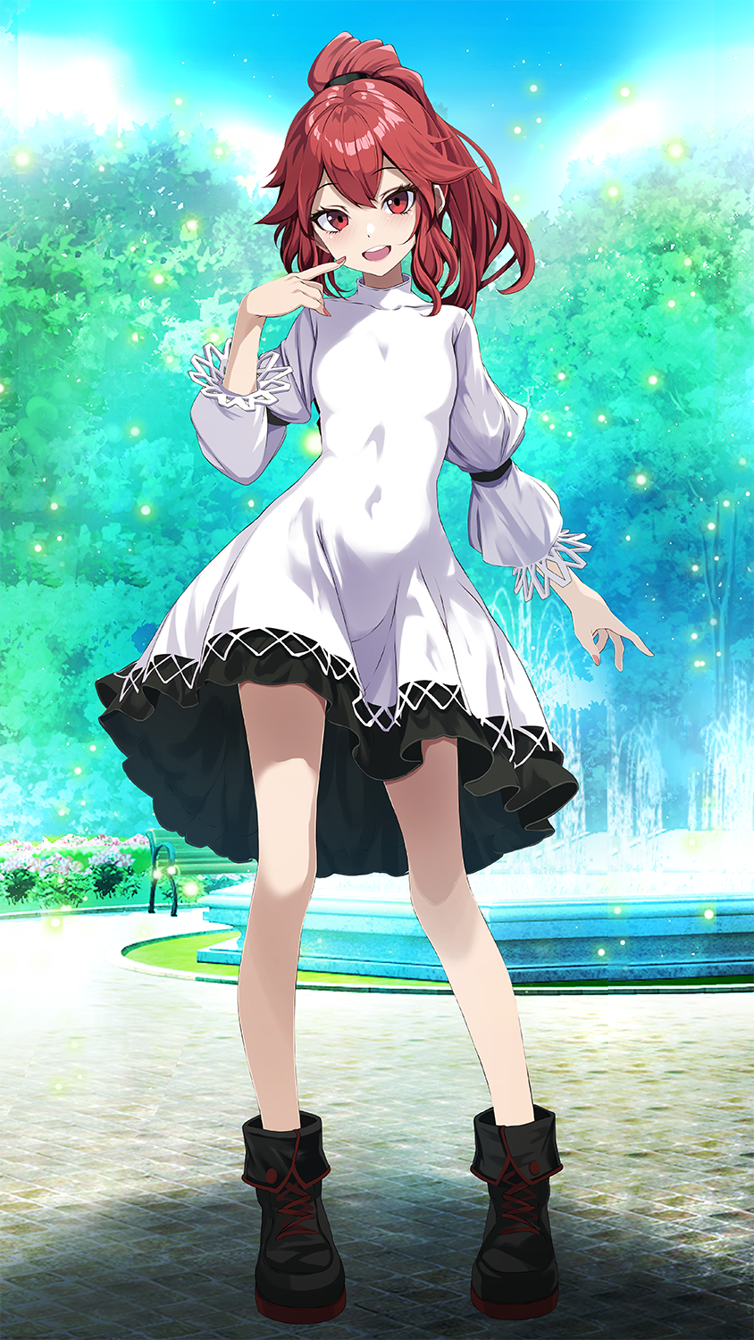 1girl :d anna_(fire_emblem) anna_(fire_emblem_engage) black_boots blue_sky boots breasts cloud day dress fire_emblem fire_emblem_engage full_body head_tilt highres long_hair long_sleeves looking_at_viewer nintendo open_mouth outdoors pointing pointing_at_self ponytail red_eyes red_hair sidelocks sky small_breasts smile solo standing tsukishiro_saika white_dress