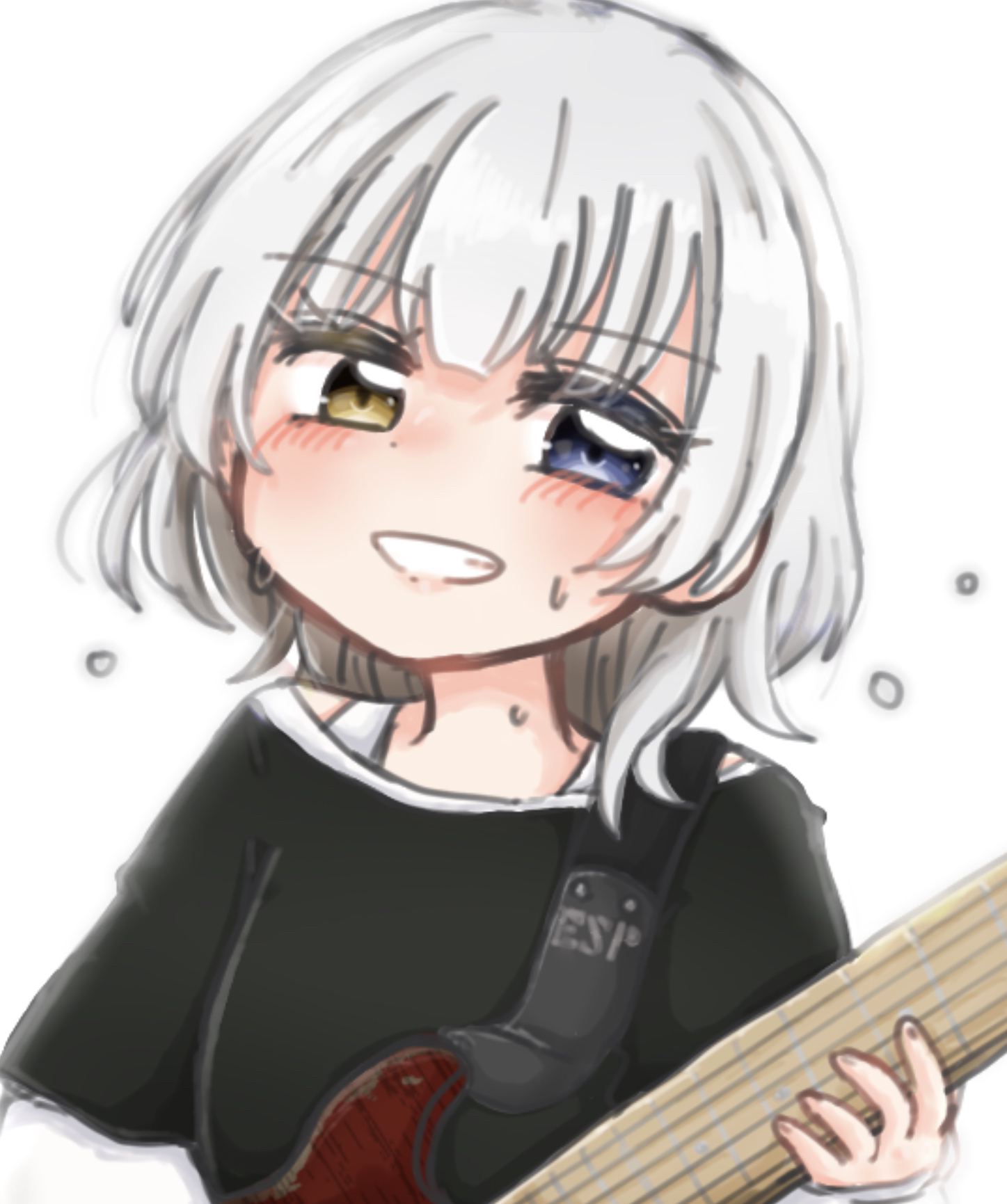 1girl bang_dream! bang_dream!_it's_mygo!!!!! black_shirt blue_eyes blush commentary_request electric_guitar grin guitar heterochromia highres instrument kaname_raana looking_at_viewer medium_hair open_mouth playing_guitar playing_instrument same_(same_d4) shirt simple_background smile solo sweat upper_body white_background white_hair yellow_eyes