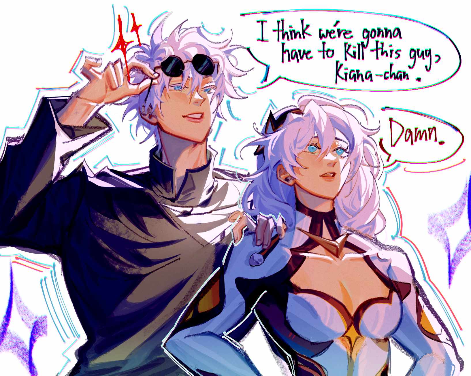 1boy 1girl battlesuit black_hairband black_shirt blue_eyes bodysuit breasts cleavage cleavage_cutout clothing_cutout collarbone commentary covered_collarbone crossover english_commentary english_text eyewear_on_head fingernails gojo_satoru hair_between_eyes hairband hand_on_another's_shoulder hands_on_own_hips hands_up highres honkai_(series) honkai_impact_3rd i_think_we're_gonna_have_to_kill_this_guy_steven_(meme) imnotxreitive jujutsu_kaisen kiana_kaslana kiana_kaslana_(white_comet) lips long_hair long_sleeves looking_to_the_side mandarin_collar medium_breasts meme official_alternate_costume open_mouth outline purple_hair round_eyewear shirt short_hair simple_background smile sparkle speech_bubble standing sunglasses teeth wavy_hair white_background white_bodysuit