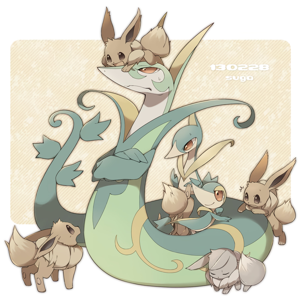 bad_id bad_pixiv_id brown_eyes closed_eyes closed_mouth crossed_arms eevee evolutionary_line gen_1_pokemon gen_5_pokemon half-closed_eyes highres nintendo no_humans open_mouth pokemon pokemon_(creature) red_eyes serperior servine sg_(suuchan) snivy sweat