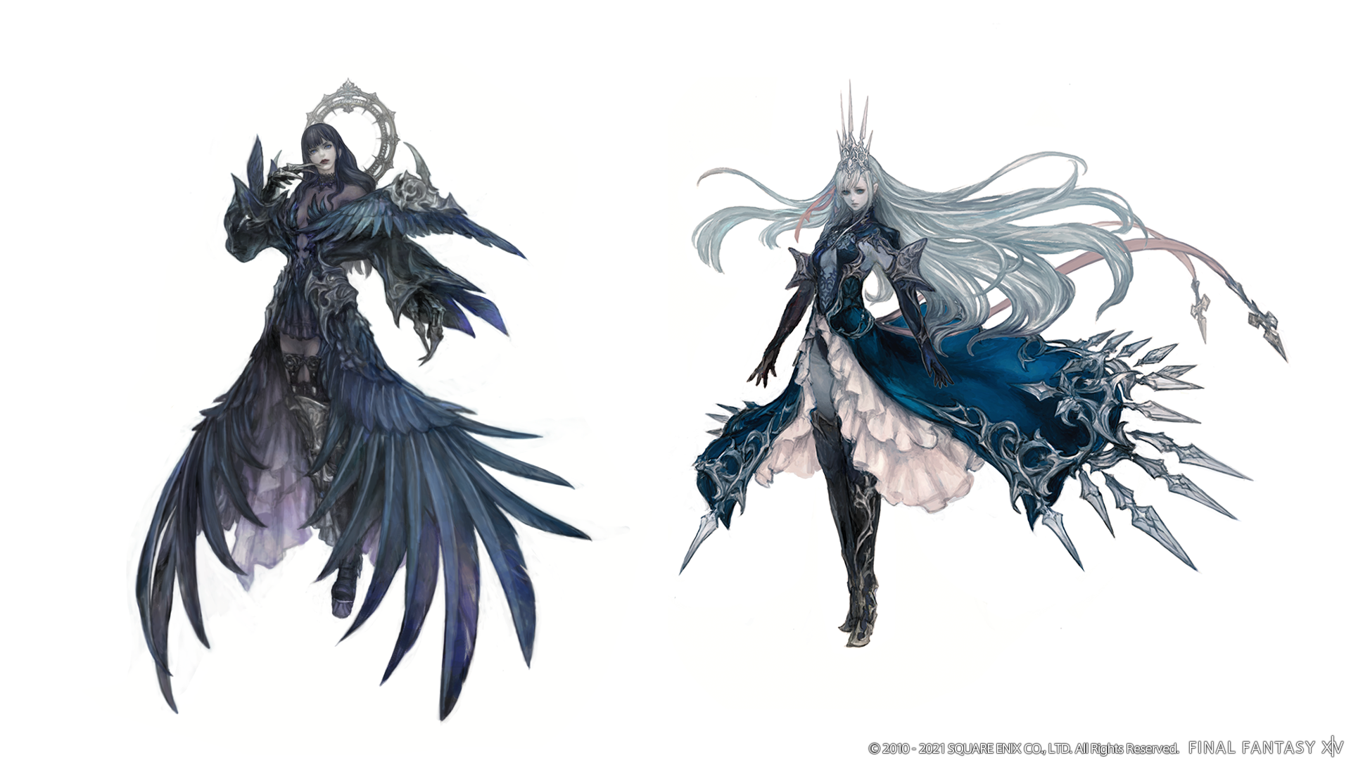 2girls alternate_form armor black_collar black_dress black_footwear black_gloves black_hair blue_dress blue_eyes boots claw_ring cleavage_cutout clothing_cutout collar collared_dress company_name concept_art copyright_name corruption dark_persona dress elbow_gloves feathered_wings feathers final_fantasy final_fantasy_xiv floating_hair full_body gaia_(ff14) gloves hair_ribbon halo halo_behind_head hand_up highres lace_collar long_hair looking_at_viewer multiple_girls nagamine_hiroyuki official_art pauldrons plunging_neckline possessed possession ribbon ryne_waters shiva_(final_fantasy) shoulder_armor simple_background standing thigh_boots tiara white_background white_hair wings