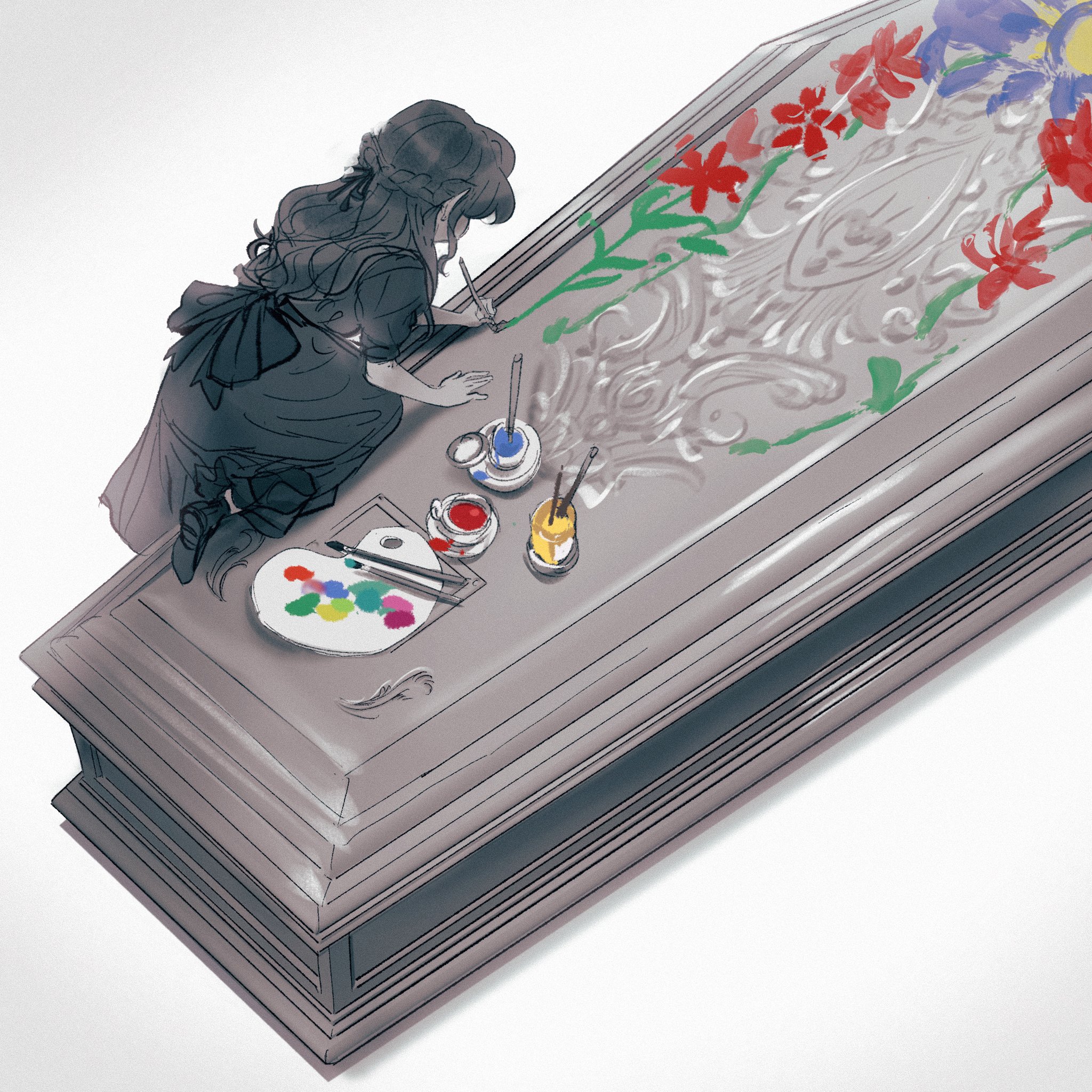 1girl back_bow black_dress black_hair bow coffin colored_skin commentary dress easel flower from_behind gradient_background grey_background grey_skin hair_bow highres holding holding_paintbrush jar kneeling leaning_forward long_hair looking_down original paint paintbrush painting_(action) pointy_ears princecanary solo untranslatable_commentary vampire