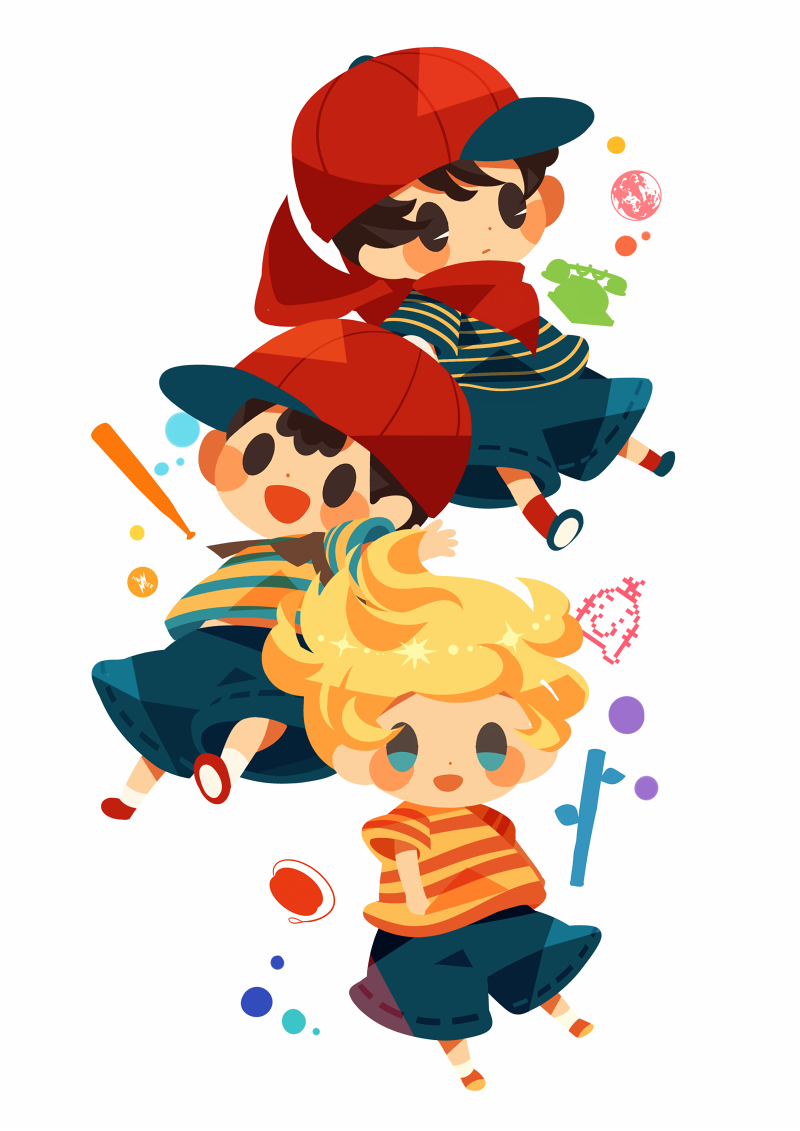 3boys baseball_cap black_hair blonde_hair blue_eyes branch chibi child crossover doseisan expressionless full_body happy hat hitofutarai in-franchise_crossover lucas_(mother_3) male_focus mother_(series) mother_1 mother_2 mother_3 multiple_boys music ness_(mother_2) ninten nintendo open_mouth red_socks shirt short_hair shorts smile socks striped_clothes striped_shirt