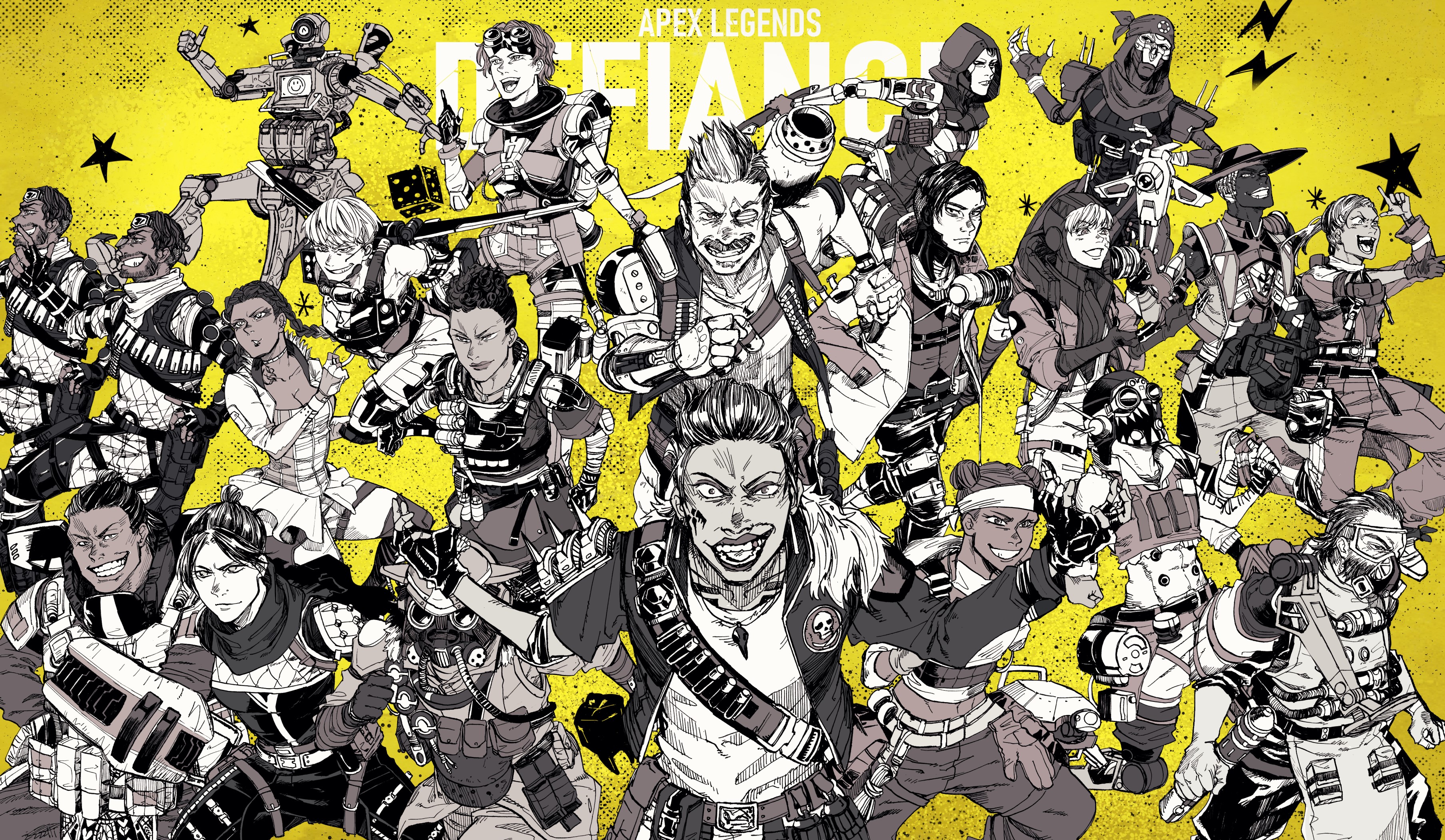 1other 6+boys 6+girls ^_^ abs absurdres ambiguous_gender android apex_legends armor ash_(titanfall_2) aviator_cap bandana bloodhound_(apex_legends) bodysuit braid breastplate breasts caustic_(apex_legends) cleavage clone closed_eyes collarbone crazy_eyes crazy_smile cropped_vest crypto_(apex_legends) dark-skinned_female dark-skinned_male dark_skin everyone face_piercing facial_hair finger_gun floating_hair frown fur-trimmed_jacket fur_trim fuse_(apex_legends) gas_mask gibraltar_(apex_legends) goggles goggles_on_head greyscale_with_colored_background hack_(apex_legends) hair_bun hazmat_suit headband highres holding holding_sword holding_weapon hood hood_up horizon_(apex_legends) humanoid_robot jacket jetpack jumpsuit lifeline_(apex_legends) lightning_bolt_symbol lip_piercing loba_(apex_legends) long_hair mad_maggie_(apex_legends) mask mechanical_arms medium_breasts midriff mirage_(apex_legends) missile_pod mouth_mask multiple_boys multiple_girls mustache navel octane_(apex_legends) one-eyed open_mouth pathfinder_(apex_legends) piercing rampart_(apex_legends) revenant_(apex_legends) robot seer_(apex_legends) shiba_shiba short_hair single_hair_bun single_mechanical_arm smile spacesuit star_(symbol) sword twin_braids valkyrie_(apex_legends) vest wattson_(apex_legends) weapon wraith_(apex_legends) yellow_background