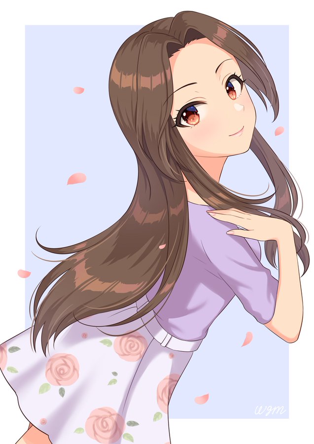 1girl artist_name belt blue_background blush border breasts brown_eyes brown_hair closed_mouth commentary_request cowboy_shot curtained_hair dutch_angle eyelashes falling_petals floral_print floral_print_skirt forehead from_behind hand_up idolmaster idolmaster_cinderella_girls komuro_chinami light_blush lipstick long_hair looking_at_viewer looking_back makeup nail_polish official_alternate_costume outside_border petals pink_lips pink_nails pink_petals print_skirt purple_shirt purple_skirt rose_print shirt signature skirt smile solo standing straight_hair wgm_oekaki white_belt white_border