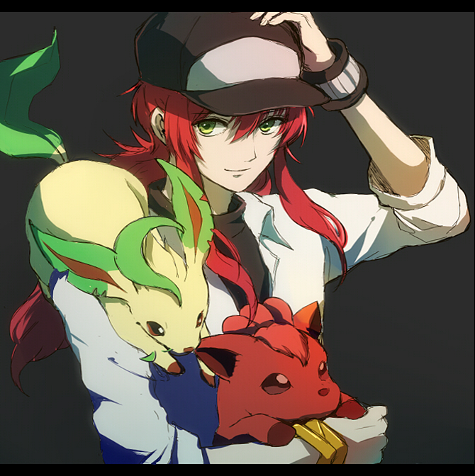 1boy brown_eyes cosplay crossover gen_1_pokemon gen_4_pokemon kurama_(yu_yu_hakusho) leafeon long_hair male_focus n_(pokemon) n_(pokemon)_(cosplay) nintendo orange_hair ourisansan pokemon pokemon_black_and_white red_hair smile vulpix yellow_eyes yuu_yuu_hakusho