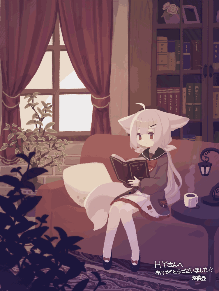 1girl ahoge animal_ear_fluff animal_ears animated animated_gif asymmetrical_legwear bag black_sailor_collar black_shoes book bookshelf bow bowtie braid brown_eyes brown_jacket collar collarbone commission couch cup curtains dress floral_print footwear_bow fox_ears fox_girl fox_tail full_body hair_between_eyes hair_ornament hairclip holding holding_book indoors jacket knees_together_feet_apart large_ears large_tail long_hair long_sleeves low_twintails mug nonaprev on_couch open_book open_clothes open_jacket original plaid_clothes plaid_sleeves plant potted_plant puffy_long_sleeves puffy_sleeves reading red_bow red_eyes red_ribbon ribbon sailor_collar sakurada_shiro_(autumn)_(hy_plus) sakurada_shiro_(hy_plus) shoes short_dress shoulder_bag side_braid signature silhouette single_sock single_thighhigh sitting skeb_commission sleeves_past_wrists smile socks solo tail thank_you thighhighs twintails uneven_legwear very_long_hair white_collar white_dress white_hair white_socks white_thighhighs window